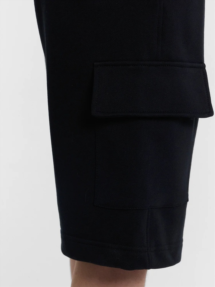 Шорты свободного силуэта из трикотажного полотна футера. Пояс цельнокроеный с эластичной тесьмой внутри. На передней части пояса с внутренней стороны пробиты петли и втянут шнур. На передних половинках обработаны карманы с наклонным входом от боковых швов. На боковые швы
