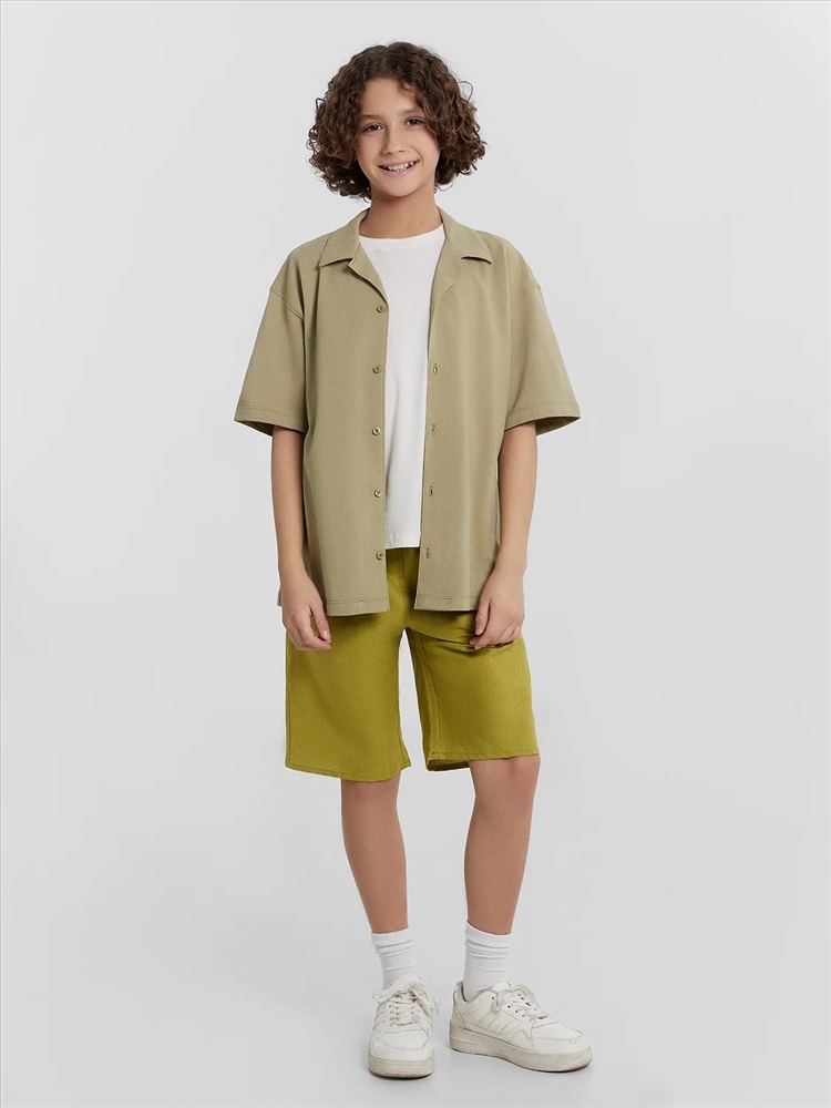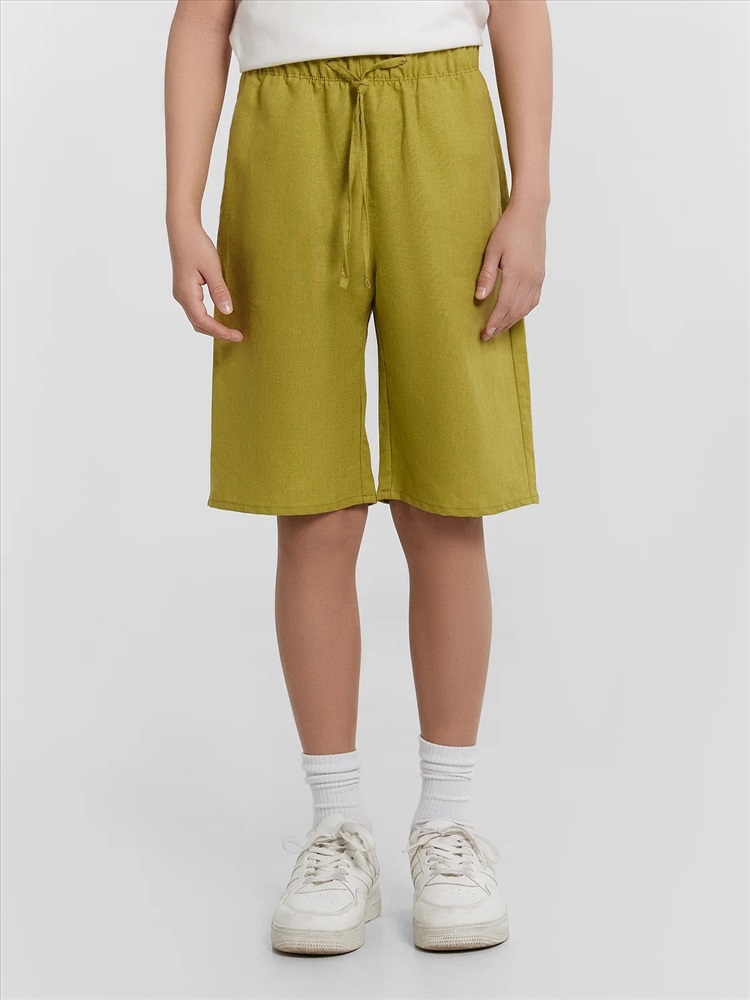 Шорты для мальчиков из ткани. Шорты с классической линией талии. Силуэт прямой. Пояс отрезной. Боковые швы перенесены вперед. Карманы в боковых швах. На внутренней стороне пояса пробиты петли, втянут шнур из основного полотна. Низ шорт обработан швом в подгибку.