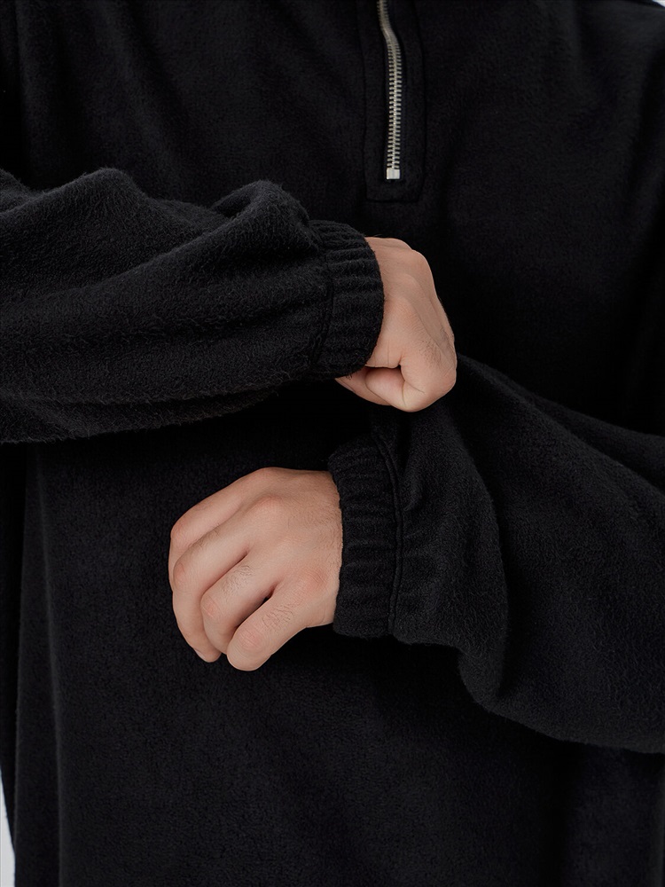 Черный мужской свитшот из мягкого флиса — идеальный выбор для прохладной погоды. Модель свободного прямого кроя со слегка спущенной линией плеча обеспечивает комфорт и свободу движений. Удобная застежка-молния по центру позволяет легко регулировать терморегуляцию.