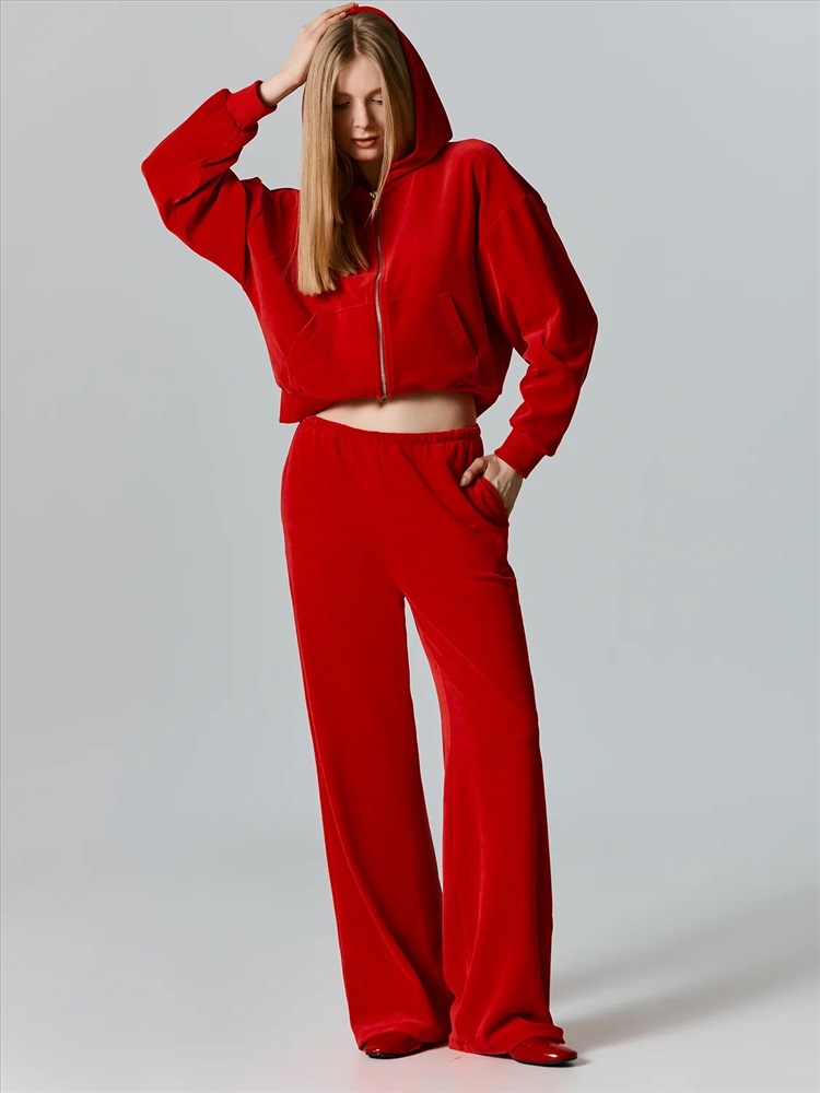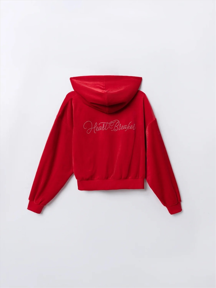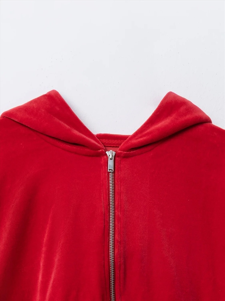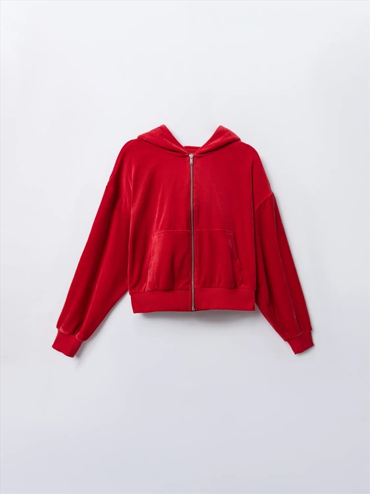 Толстовка женская свободного силуэта. Перед и спинка цельнокроеные. Рукава длинные, втачные. По переду центральная застежка на металлическую молнию и накладные карманы. Горловина обработана капюшоном. По низу рукавов манжеты, пояс и манжеты из рибаны.