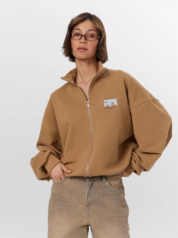 Женская толстовка на молнии с надписью «Момент» — идеальный спутник для ваших самых ярких дней. Свободный оверсайз крой и воротник-стойка, облегающий шею, надежно защищает от ветра и прохлады, даря ощущение комфорта. Длинные рукава с эластичными манжетами и поясом из рибаны мягко облегают фигуру, подчеркивая стильный силуэт.