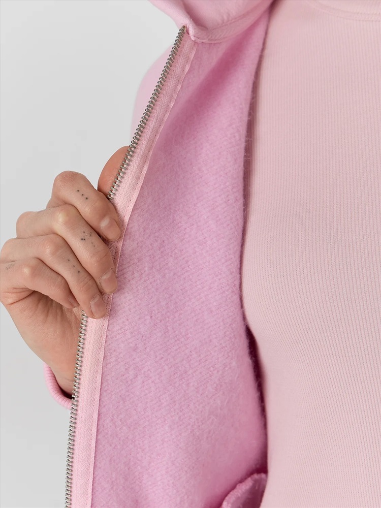 Свободный крой со спущенным плечом и длинными рукавами создаёт расслабленный силуэт. Капюшон, боковые карманы с мягкой подкладкой для хранения мелочей и застежка на молнию, которую можно легко расстегнуть до комфортного уровня, добавляют повседневного удобства и практичности. Эластичные манжеты и пояс из рибаны помогают сохранять тепло и обеспечивают аккуратную посадку.