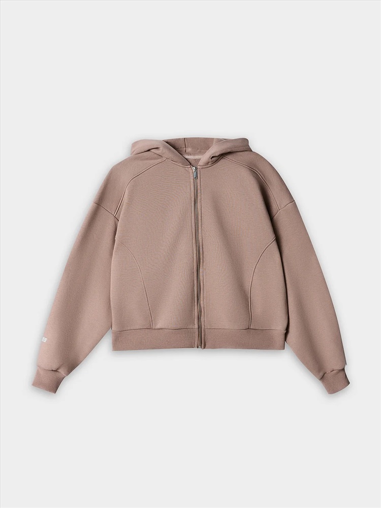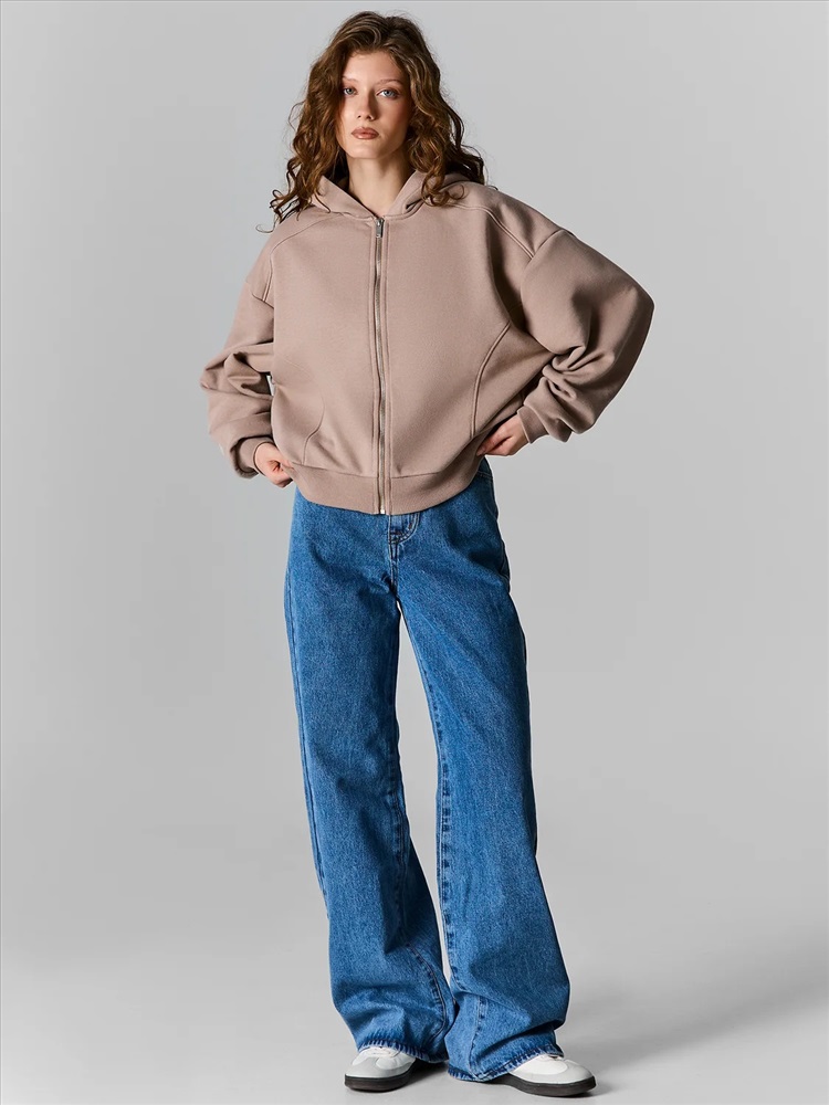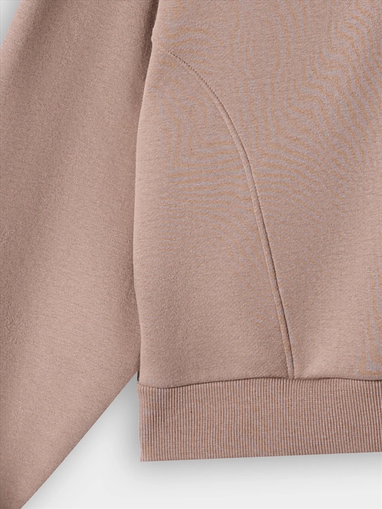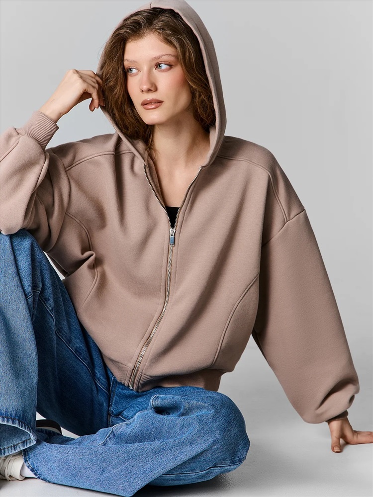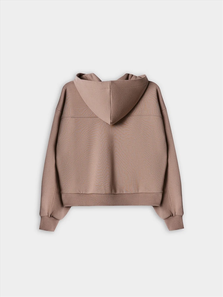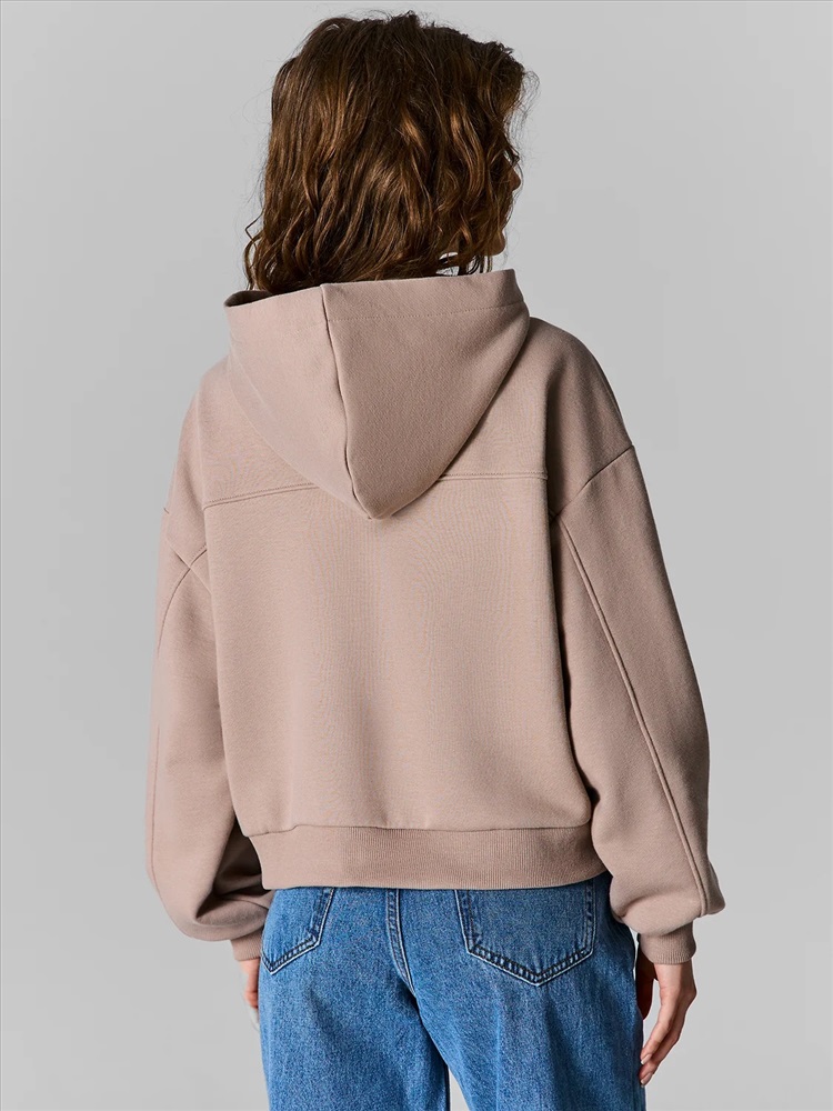 Толстовка свободного силуэта из трикотажного полотна футер. Горловина круглая, обработана капюшоном.