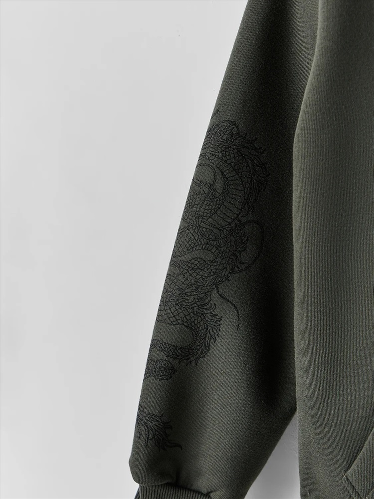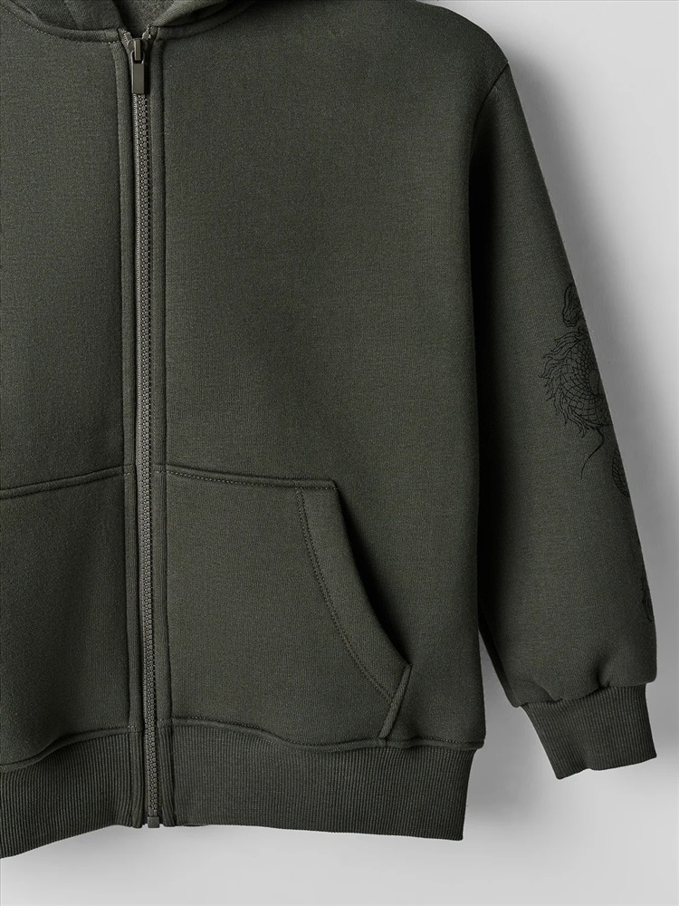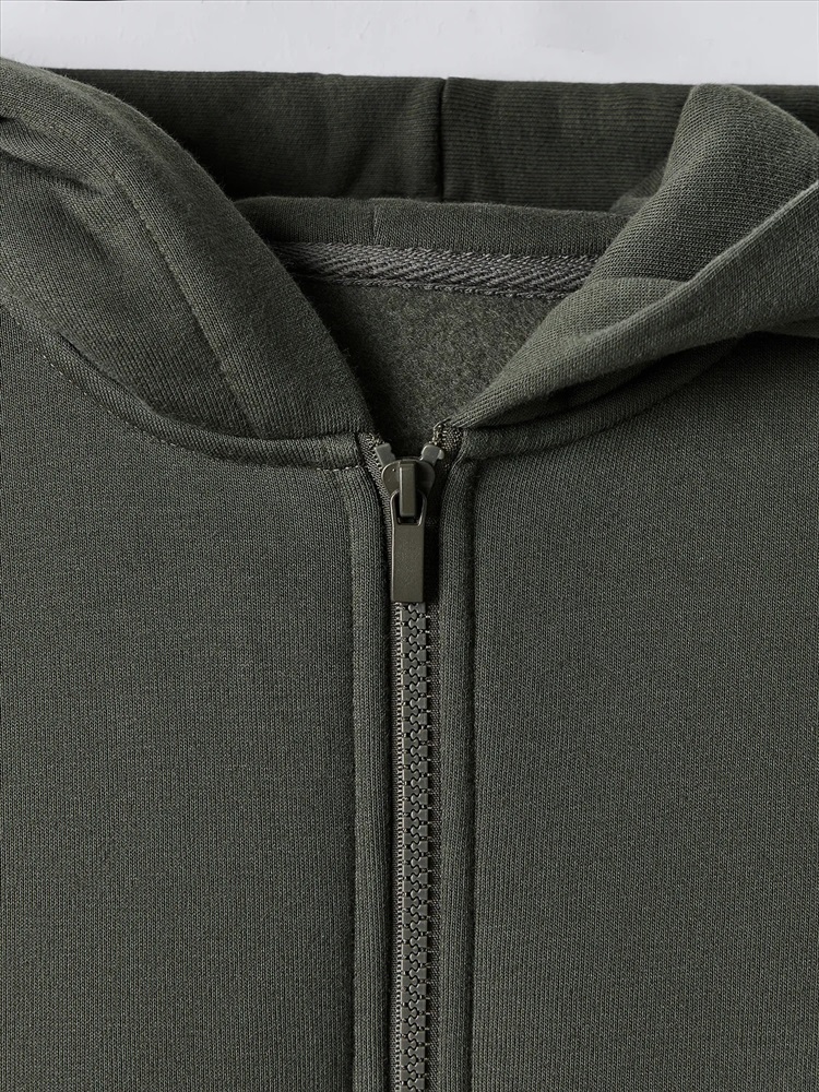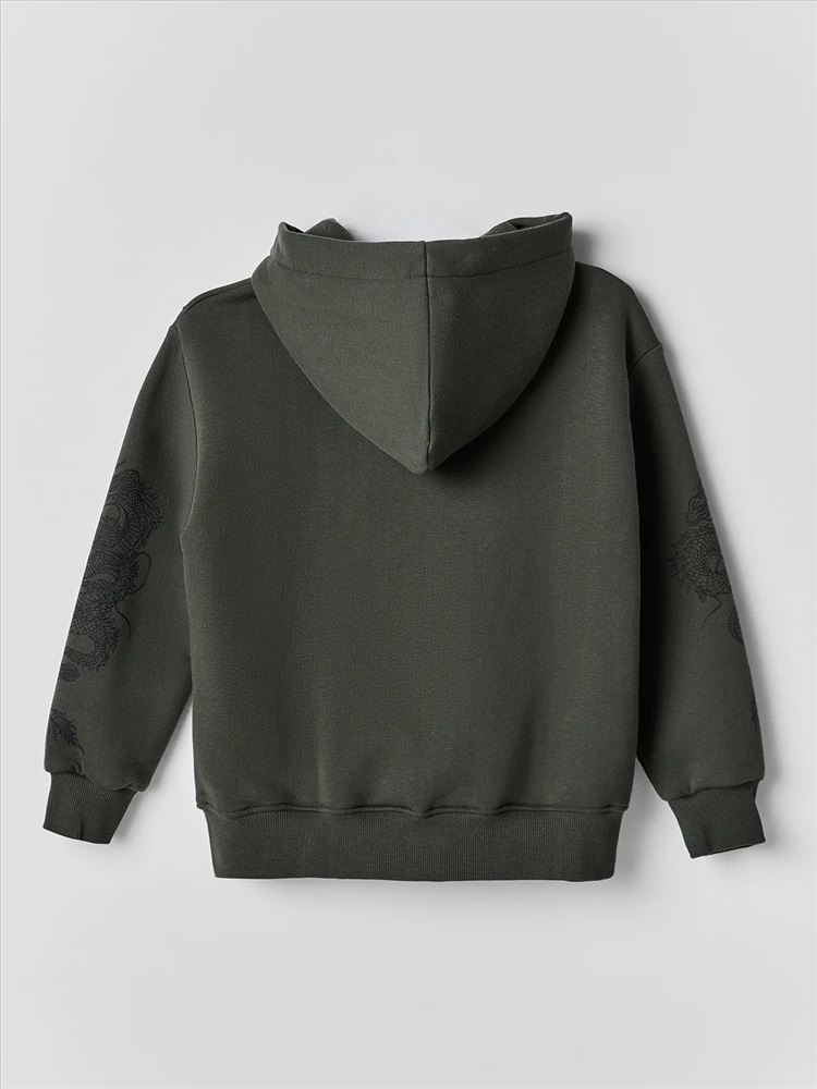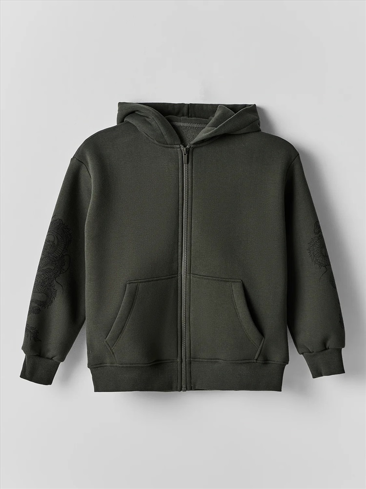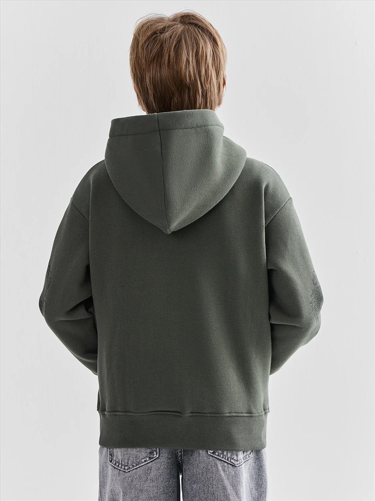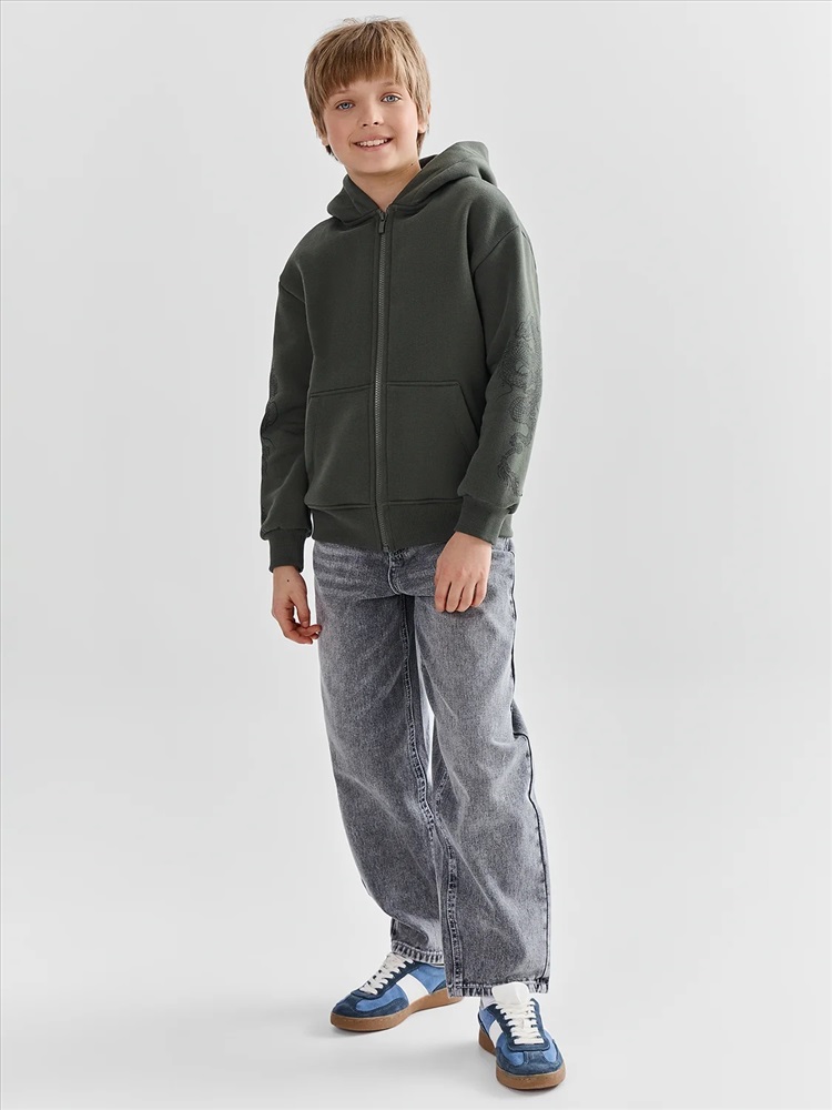 Жакет для мальчиков прямого силуэта с капюшоном. Капюшон на подкладке из основного полотна. Шов втачивания капюшона закрыт х/б тесьмой. Рукава втачные, линия плеча спущена. Притачные манжеты по низу рукавов и притачной пояс из рибаны. По переду застежка молния, карман кенгуру.