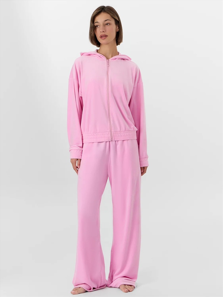 Манжеты на рукавах и пояс по низу, дополненные декоративными строчками, обеспечивают аккуратную посадку. Внутренние швы горловины обработаны мягкой хлопковой тесьмой для приятных тактильных ощущений. Велюровый материал с добавлением эластана мягко тянется и дарит нежность при каждом движении. Эта толстовка станет любимым предметом гардероба для спокойных вечеров и утреннего отдыха.