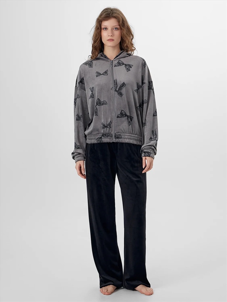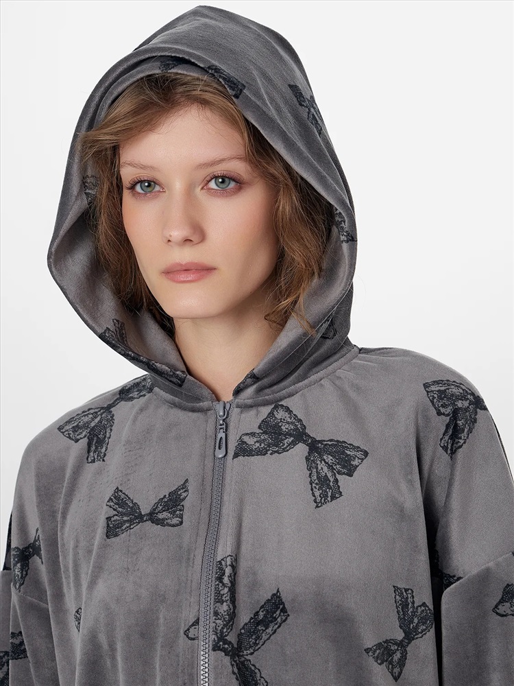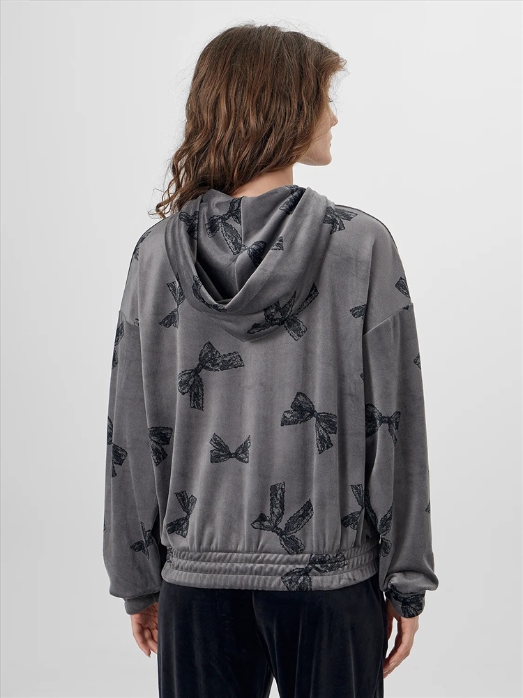 Манжеты на рукавах и пояс по низу, дополненные декоративными строчками, обеспечивают аккуратную посадку. Внутренние швы горловины обработаны мягкой хлопковой тесьмой для приятных тактильных ощущений. Велюровый материал с добавлением эластана мягко тянется и дарит нежность при каждом движении. Эта толстовка станет любимым предметом гардероба для спокойных вечеров и утреннего отдыха.