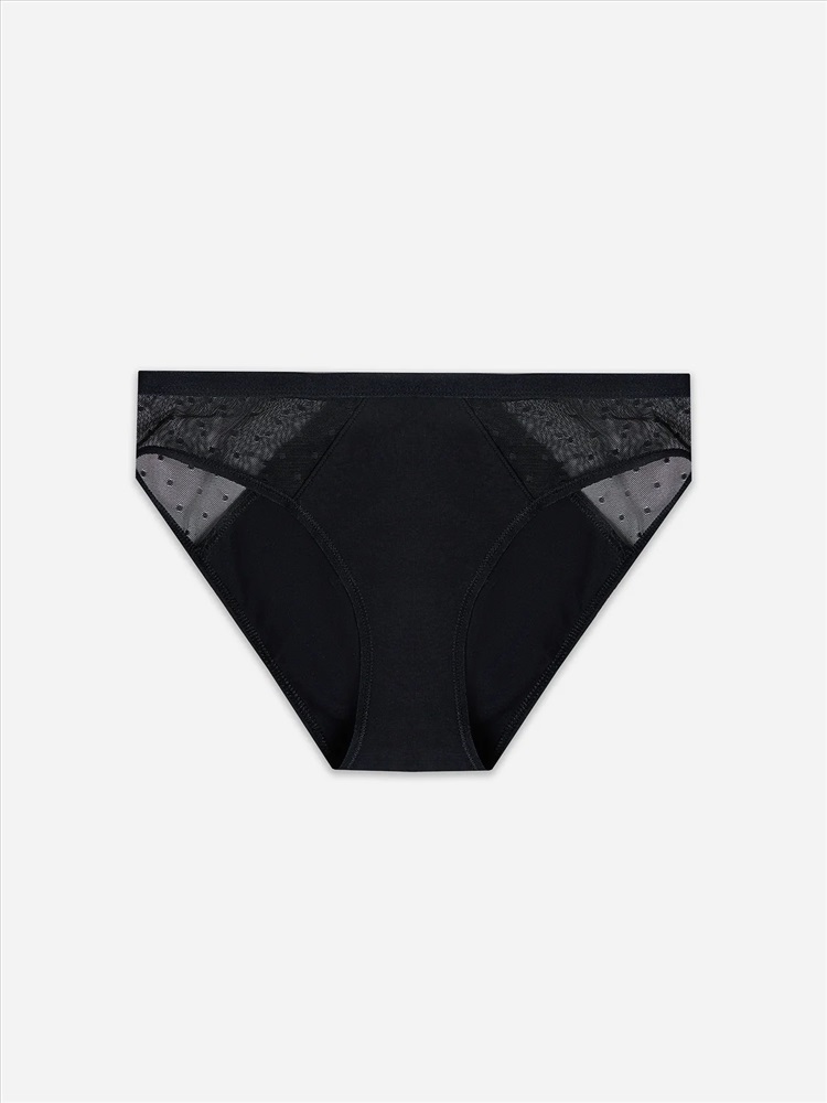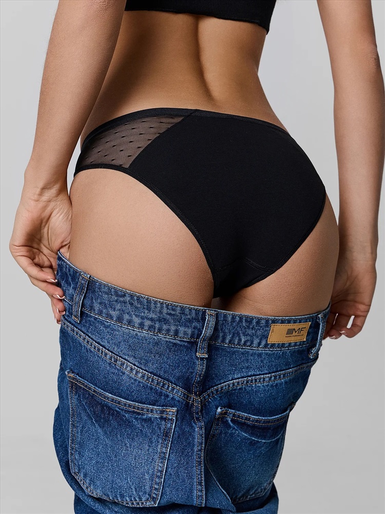 Трусы женские, средняя линия талии, силуэт - липы. Передняя и задняя центральные детали выполнены из хлопка. Боковые детали из сетки (без боковых швов). Верхний срез трусов обработан жилкой. Нижние срезы трусов обработаны жилкой 6мм. Верхний срез подкладки ластовицы отлетной.