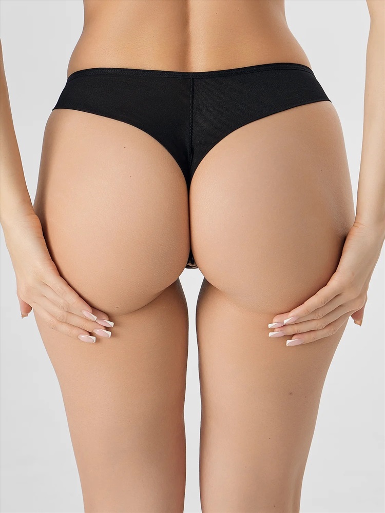 Трусы женские, средняя линия талии, силуэт - бразилиано. Передняя центральная деталь выполнена из ATLANTIS и декорирована декоративной тесьмой 11600-16К Devsel. Передние боковые детали выполнены из LIGA. Задние детали выполнены из LIGA в сгиб. подкладка ластовицы из хлопка, отлетная по верхнему срезу. Верхний и нижние срезы трусов обработаны ловаблем.