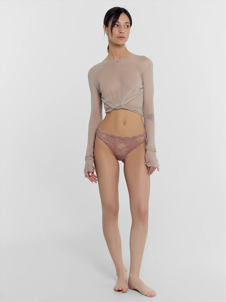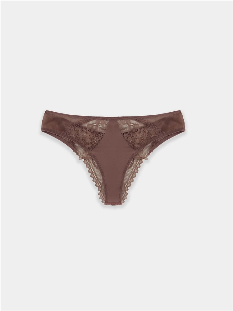 Трусы женские, высокая линия талии, силуэт - бразилиано. Передняя деталь выполнена из кружева. ластовица из кружева, подкладка из хлопка. Задние детали из р.2052. По верхнему срезу передней детали жилка 6мм. под кружевом. По верхнему срезу задней детали трусов тесьма с зубом 10мм. (рабочая зона 8мм.). Нижние срезы задних деталей обработаны в подгибку. нижние срезы передней детали и ластовицы обработаны жилкой