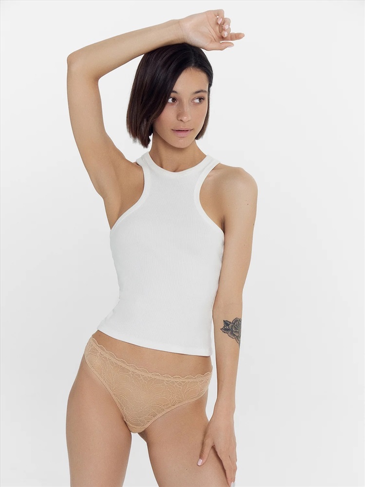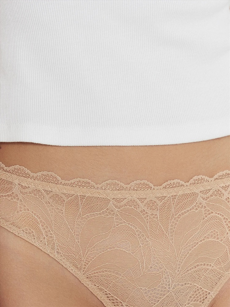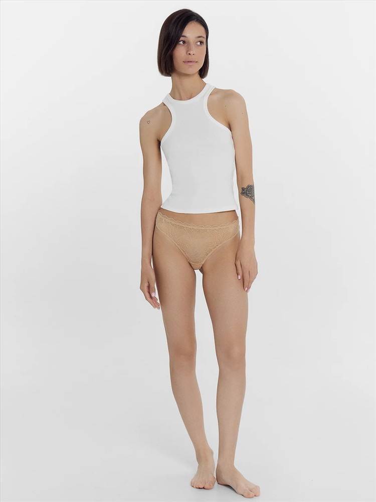 Трусы женские, высокая линия талии, силуэт - бразилиано. Передняя деталь выполнена из кружева. ластовица из кружева, подкладка из хлопка. Задние детали из р.2052. По верхнему срезу передней детали жилка 6мм. под кружевом. По верхнему срезу задней детали трусов тесьма с зубом 10мм. (рабочая зона 8мм.). Нижние срезы задних деталей обработаны в подгибку. нижние срезы передней детали и ластовицы обработаны жилкой