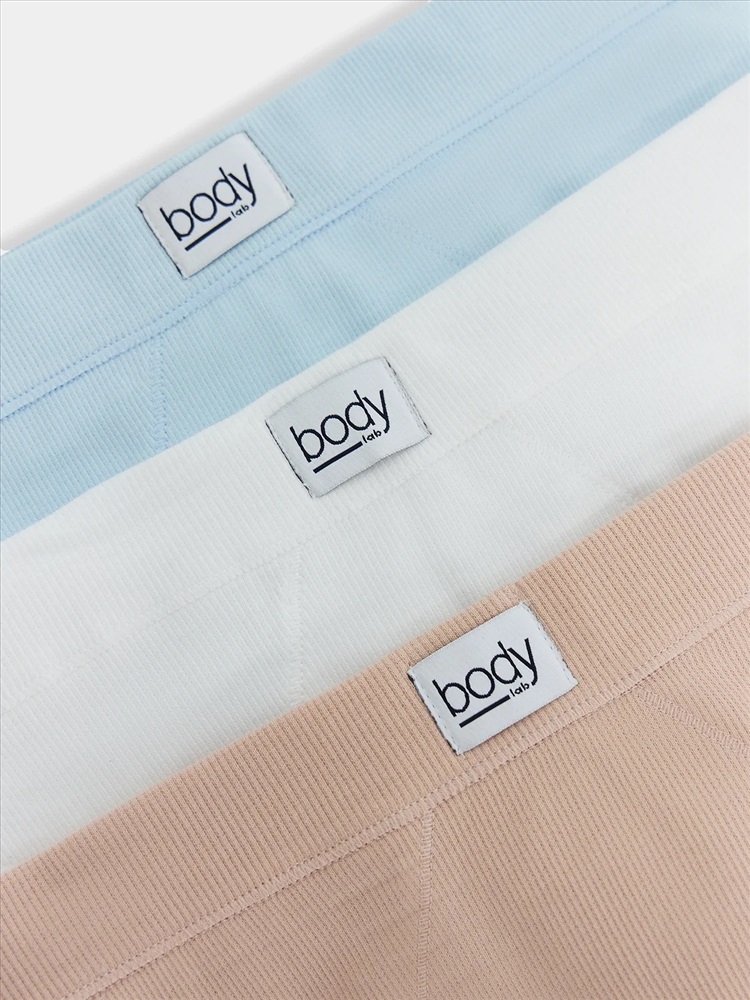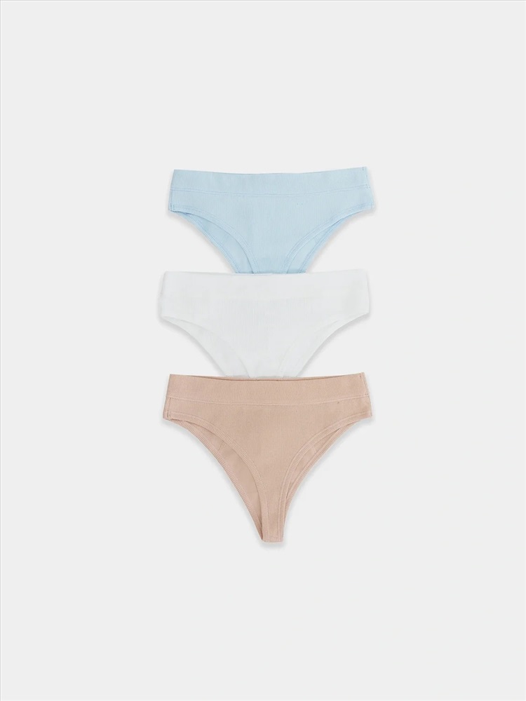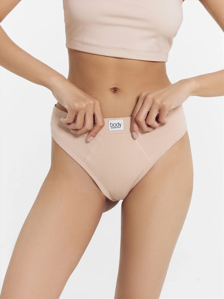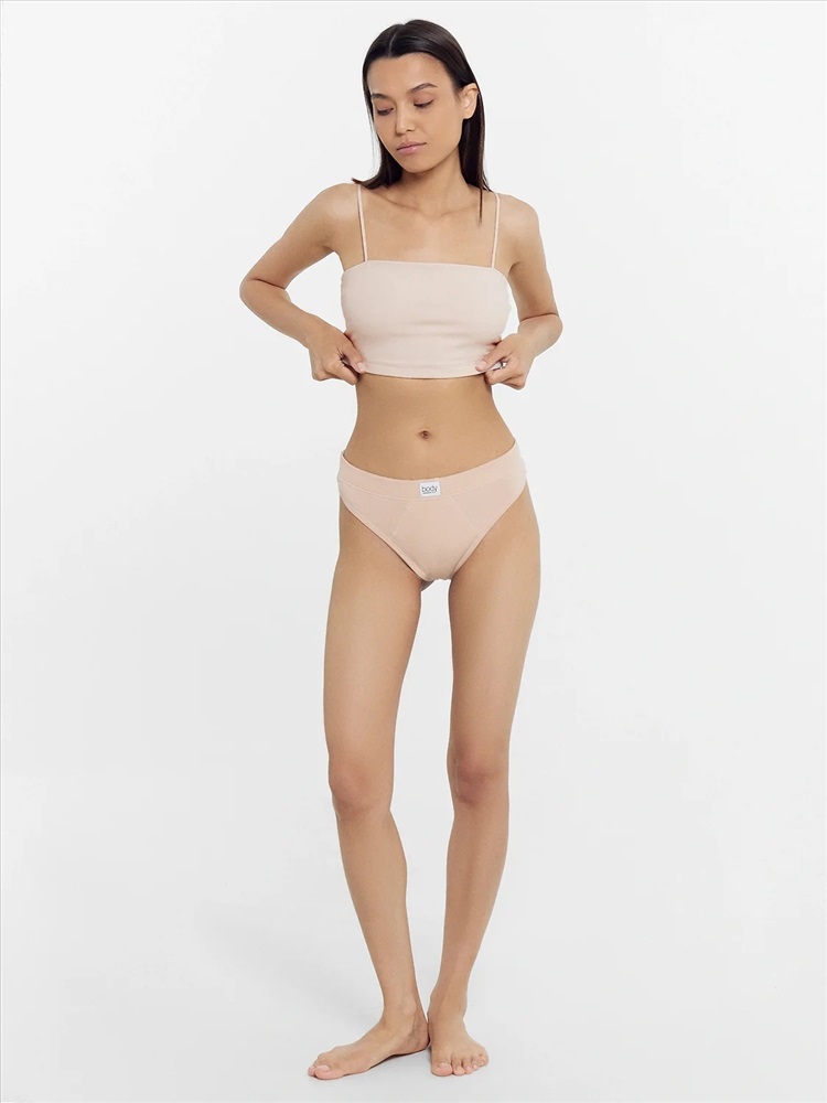 Трусы женские, средняя линия талии, силуэт - бразилиано. Передняя и задняя детали выполнены из рибаны. Верхний срез трусов обработан бейкой поперечной из рибаны, внутри жилка 6мм. Нижние срезы обработаны бейками поперечными из рибаны. Подкладка ластовицы из хлопка, верхний срез ластовицы притачан к детали из рибаны (с изнаночной стороны имитация мужского гульфика, с лицевой стороны декоративные строчки).