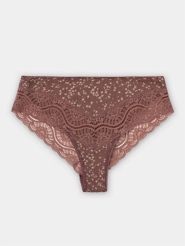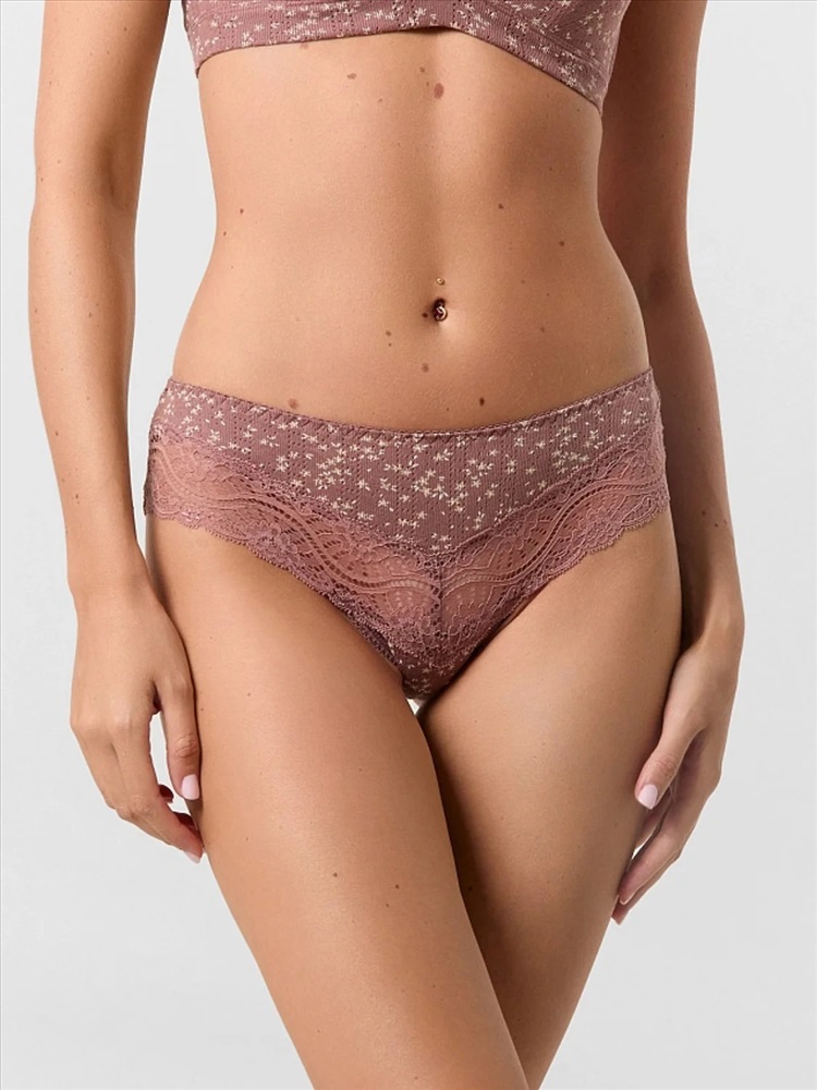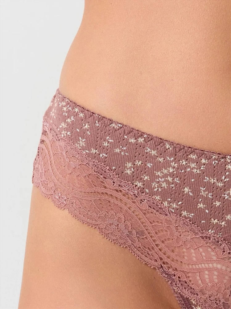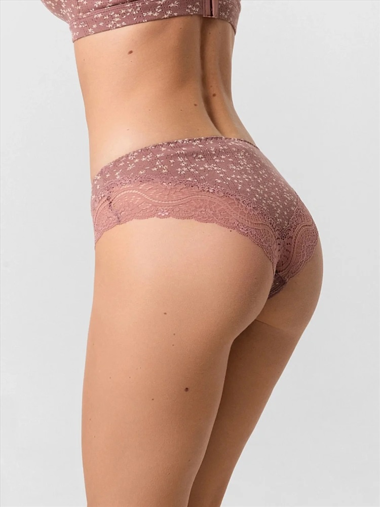 Эластичная тесьма по линии талии, аккуратно настроченная зигзагообразной строчкой, обеспечивает идеальную посадку без дискомфорта. Кружево по линии ножек добавляет образу изящную нотку, а швы на передней и задней частях подчеркивают аккуратный крой.