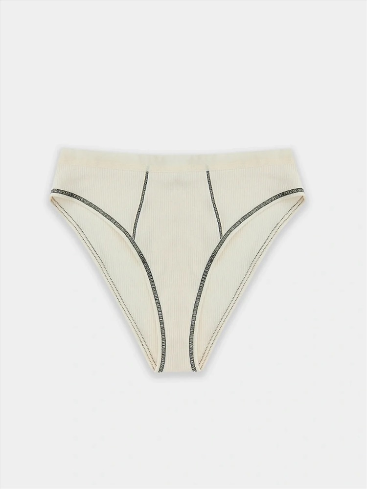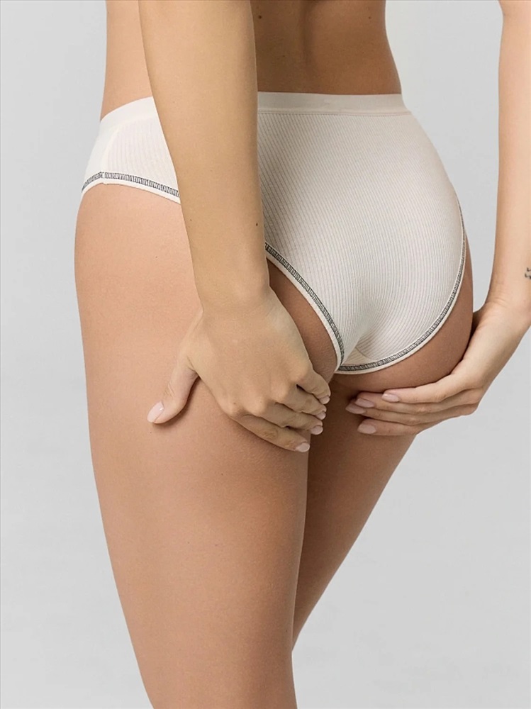 Трусы женские со средней линией талии силуэта «слип» из трикотажного полотна рибана. Передняя деталь с рельефами, по которым проложены декоративные строчки. Ластовица из кулирной глади отлетная по переднему срезу.
