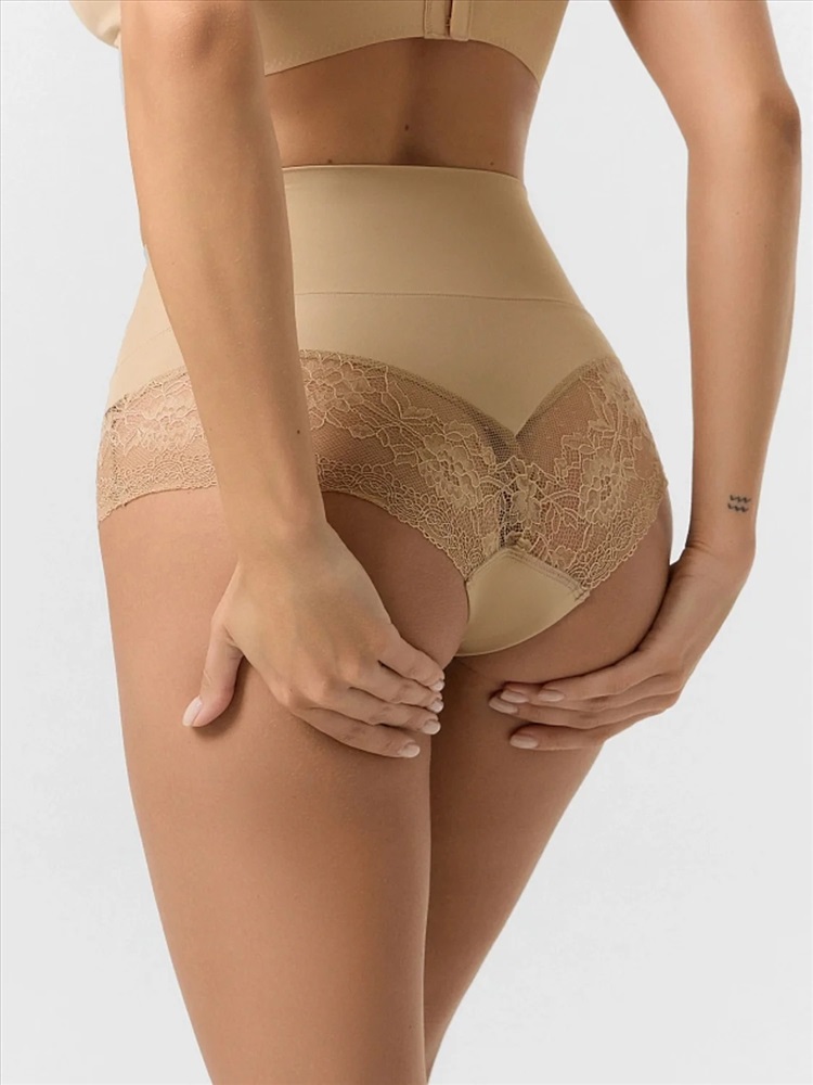 Трусы женские корректирующие с высокой посадкой, из эластичного кружева и трикотажного полотна микрофибры. Верхние детали из микрофибры соединены между собой ширителем, нижние детали из кружева. Верхняя часть двойная, со сгибом по талии. Подкладка ластовицы выполнена из кулирного полотна, отлетная по переднему краю. По срезам ластовицы жилка 6мм. внутри (WT4-6).