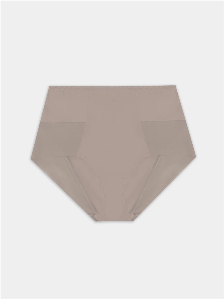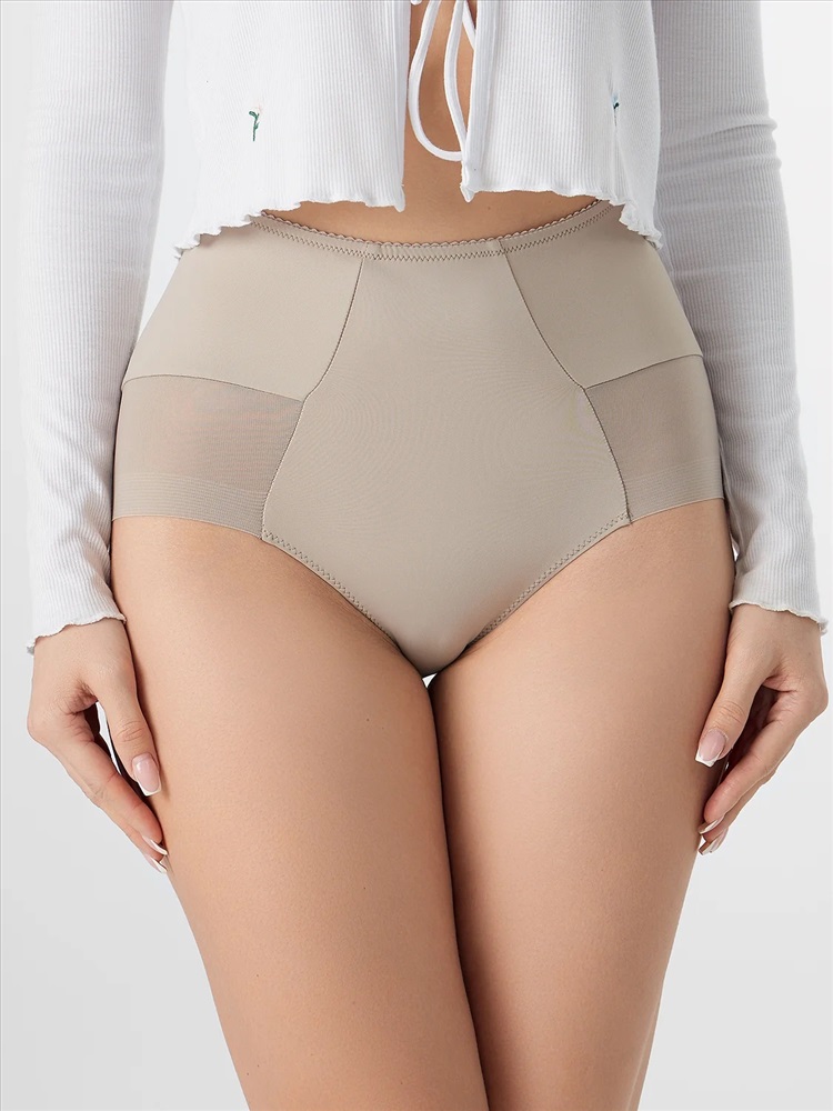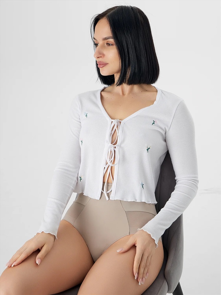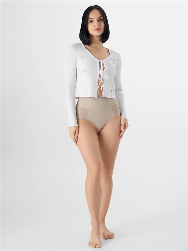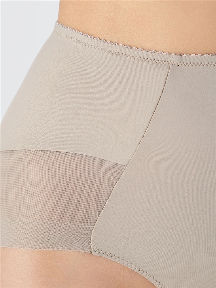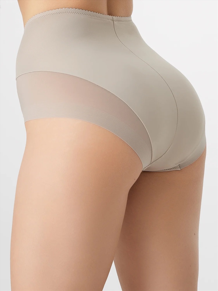 Трусы женские, силуэт макси, выполнены из трикотажного полотна микрофибра без боковых швов. По перед. половинке нижние части боковых деталей декорированы кружевом (сырой срез).