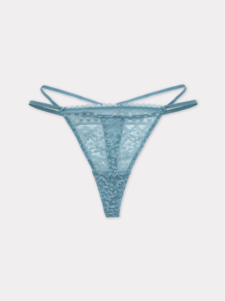 Трусы женские, средняя линия талии, силуэт - стринги. Передняя деталь выполнена из кружева. Ластовица из кружева, на подкладке из хлопка, отрезная по верхнему срезу. Задняя деталь выполнена из кружева. По верхнему срезу задней детали трусов ловабль, переходящий в протяжки. Под верхним краем кружева передней детали жилка 6мм. с изнаночной стороны. Протяжки из жилки 6мм. Нижние срезы трусов обработаны жилкой.