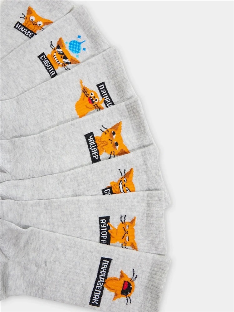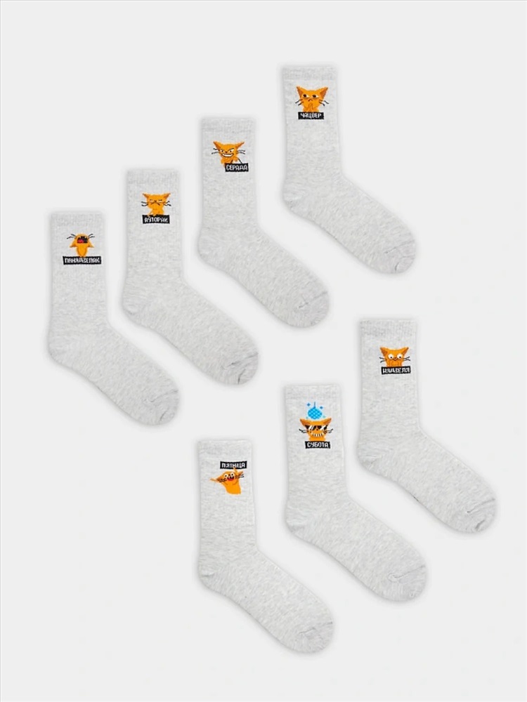 рис.2663 Мультипак из 7-х пар женских носков с высоким плотным бортом и рисунком в виде котика и надписью дней недели. составляющие: 217G-2664, 217G-2665, 217G-2666, 217G-2667, 217G-2668, 217G-2669, 217G-2670