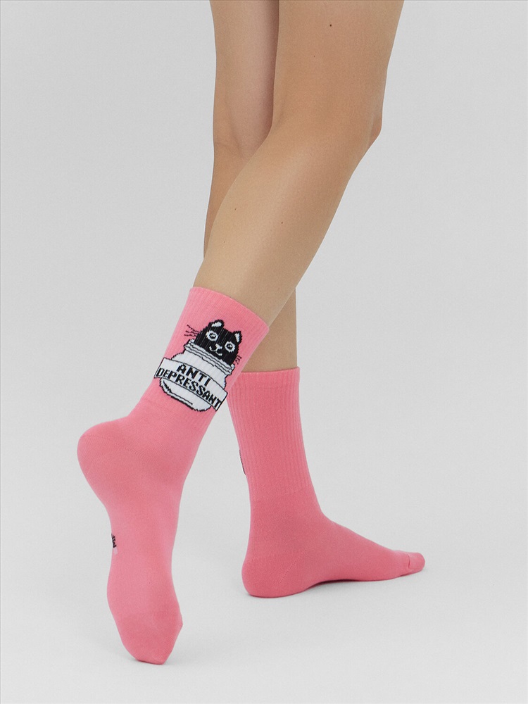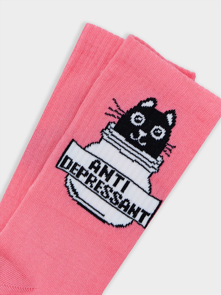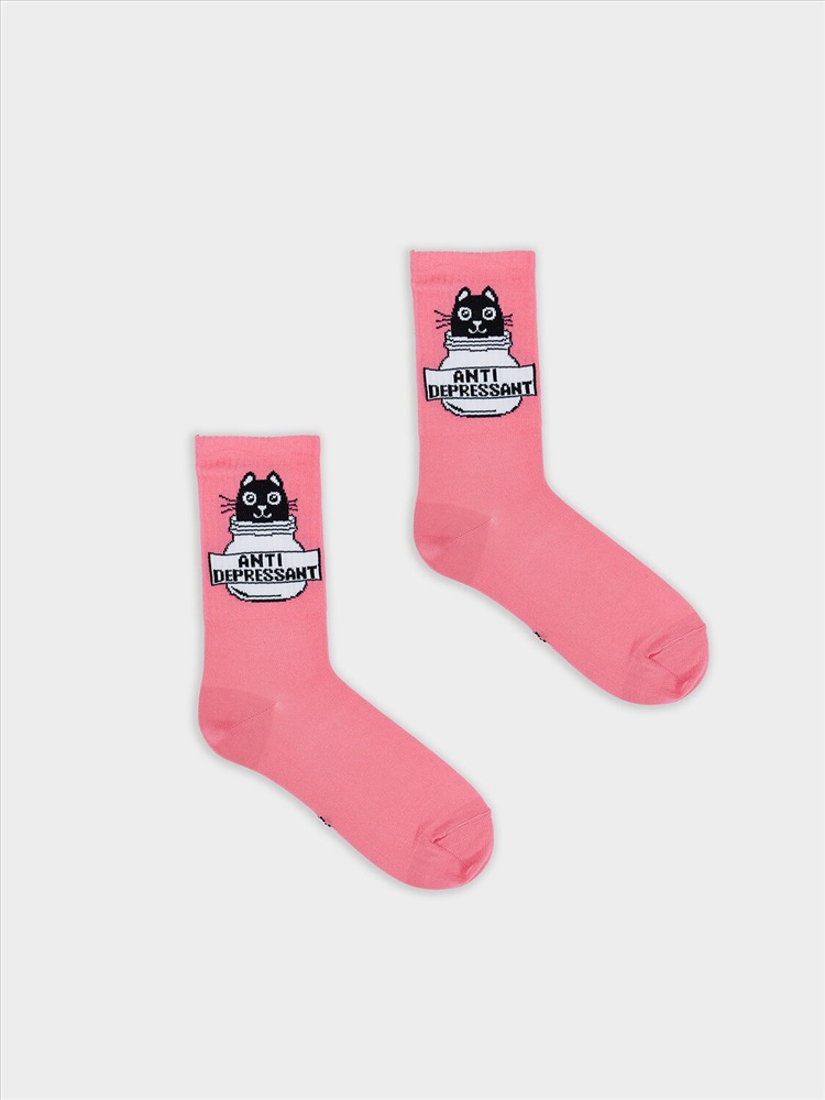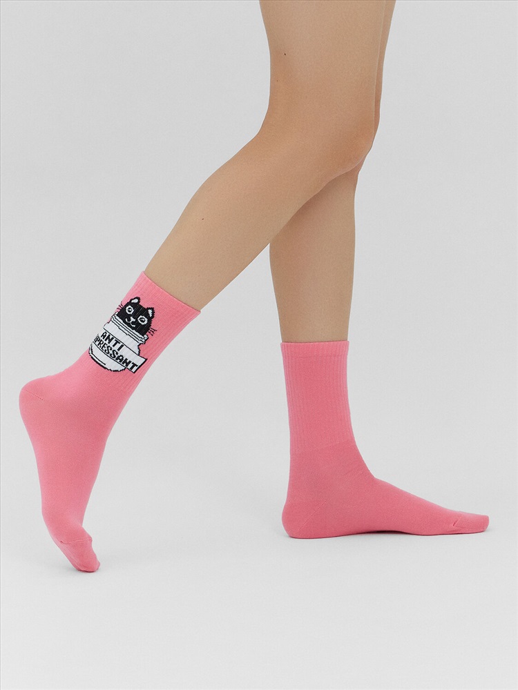 рис.2344 Женский носок с высоким плотным бортом и рисунком в виде котика.