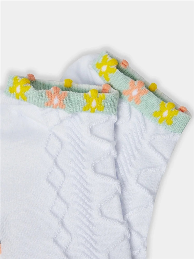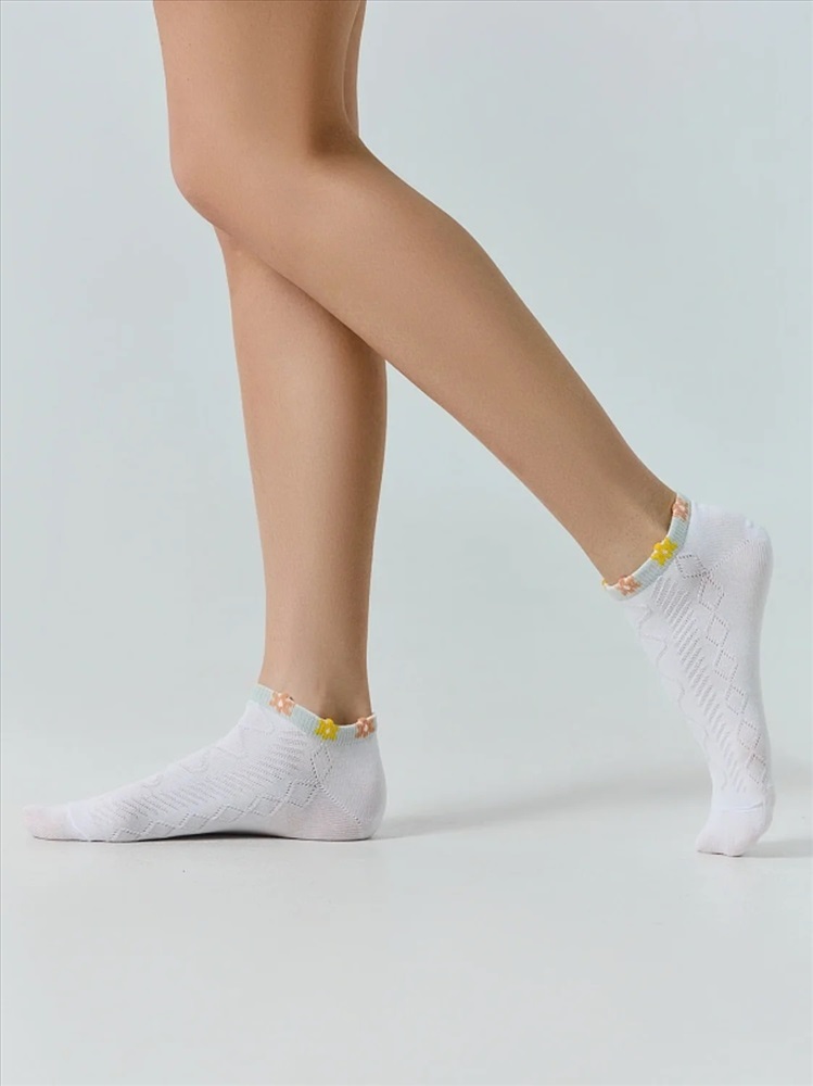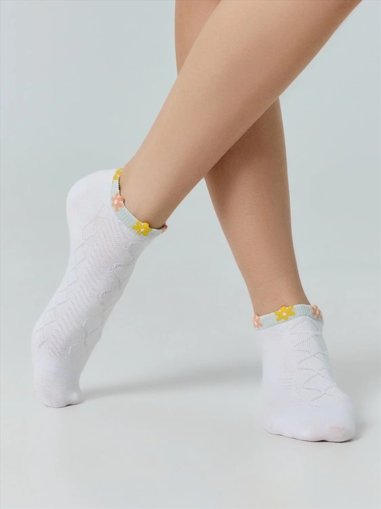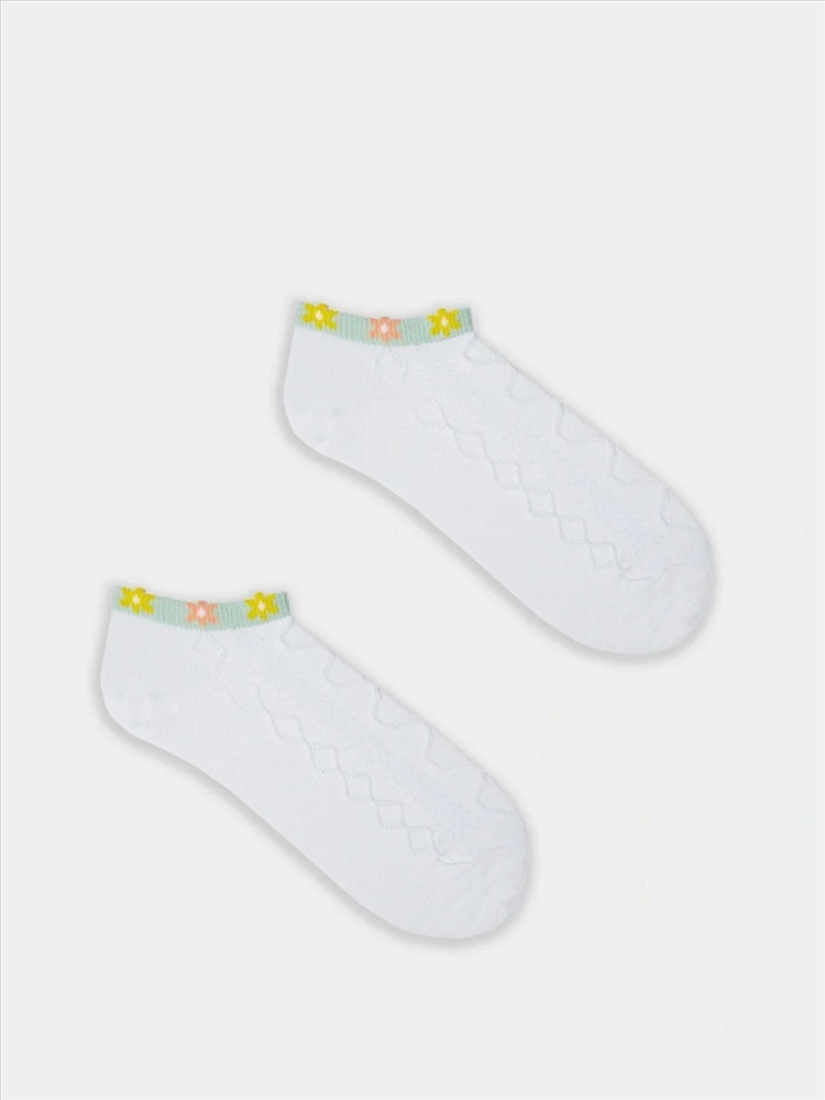 рис.3154 Женские укороченные носки, выработанные перекидным переплетением с рельефным рисунком и пикотом на бортике в виде ромашек.