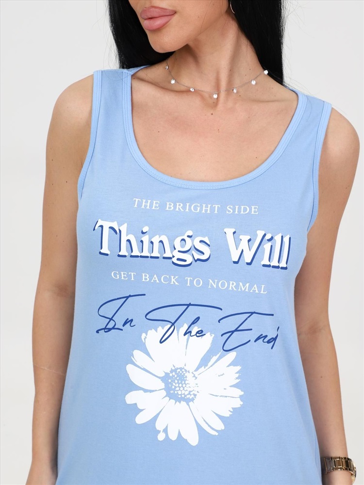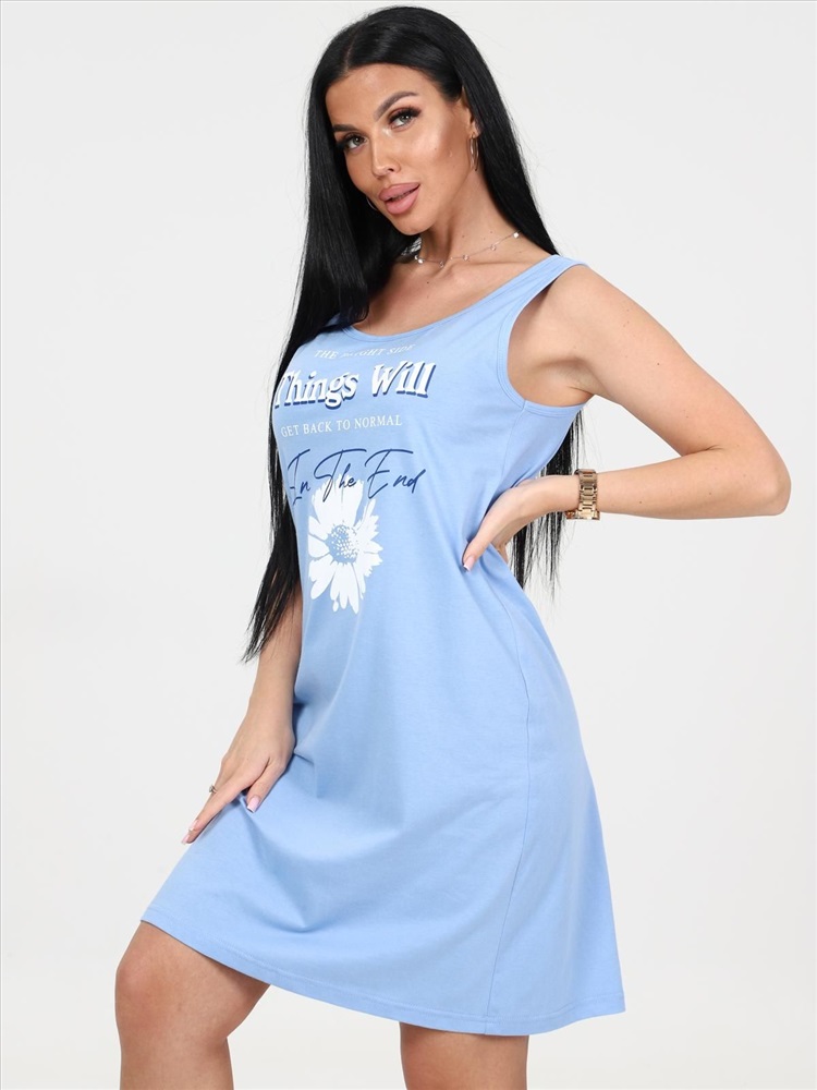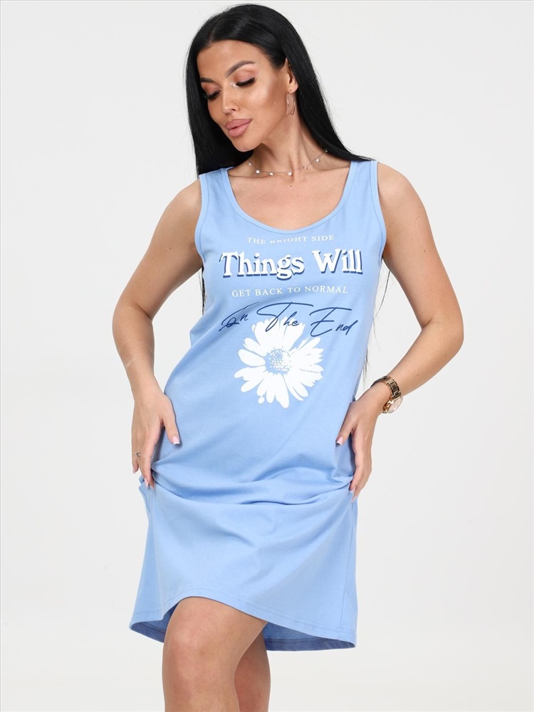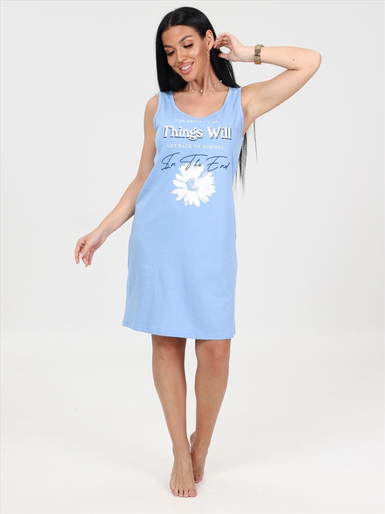 цвет: голубой Материал: Кулирка Трикотаж - Кулирка (Хлопок 100%). Сорочка выполнена из однотонного трикотажного полотна «кулирка». Сорочка полуприлегающего силуэта с круглым вырезом горловины без рукава на широких бретелях. Вырез горловины и проймы обработаны кантом из основной ткани. Сорочка украшена нежным принтом. Комментарии к товару