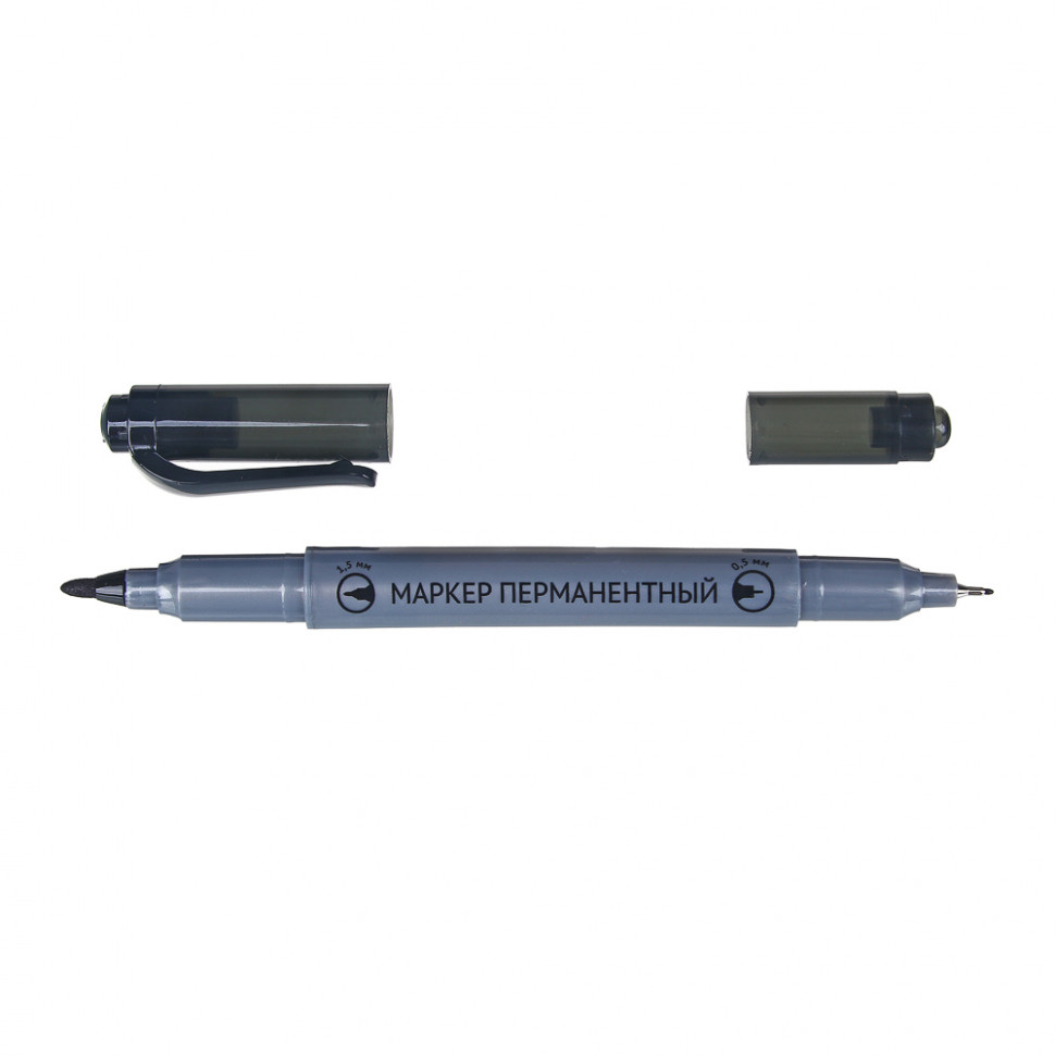 Маркер перманентный черный двухсторонний для тонких надписей предназначен для нанесения нестираемых надписей на различных типах поверхностей: дереве, пластике, керамике, бумаге. Имеет разную толщину наконечников: тонкий 1,5 мм и линер 0,4 мм. Может применяться для маркировки упаковок, нанесения разметки, а также в творчестве. Чернила устойчивы к воздействию солнечных лучей и влаги.