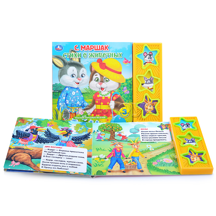 Код: 290115 Штрихкод: 9785506033134 Страна производитель: Китай Размеры упаковки: 21 x 15 x 1.5 см Количество в коробке: 30 • В книгу вошли стихи С.Я. Маршака по мотивам чешских народных песенок. • Три кнопки-звёздочки озвучены песенками. • Каждая кнопка проигрывает одну песенку из книжки. • Формат книжки: 21 х 15 см. • В книге 6 картонных страниц с яркими иллюстрациями и стихами. • Материалы: картон, пластик. • Звуковой модуль работает от 3-х батареек типа LR44 (в комплекте). • Соответствует требованиям безопасности продукции. • Возрастная категория: 0+ Комментарии к товару