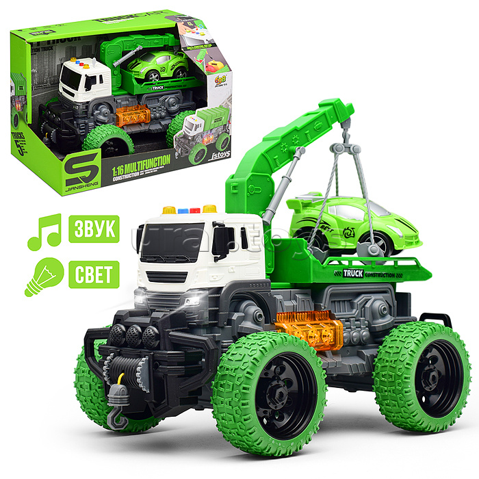 • Размеры игрушки: 31х20х21 см. • Свободный ход колес. • Подвижная платформа. • В комплект входит машинка 10 см • Функции кнопок на крыше: звук двигателя, клаксон, звук заднего хода, мигание ламп. • Свет и звук работают от 3-х батареек "AG13" (входят в комплект для демонстрации) • Материал: пластик. • Соответствует требованиям безопасности продукции. • Для детей от 3-х лет.