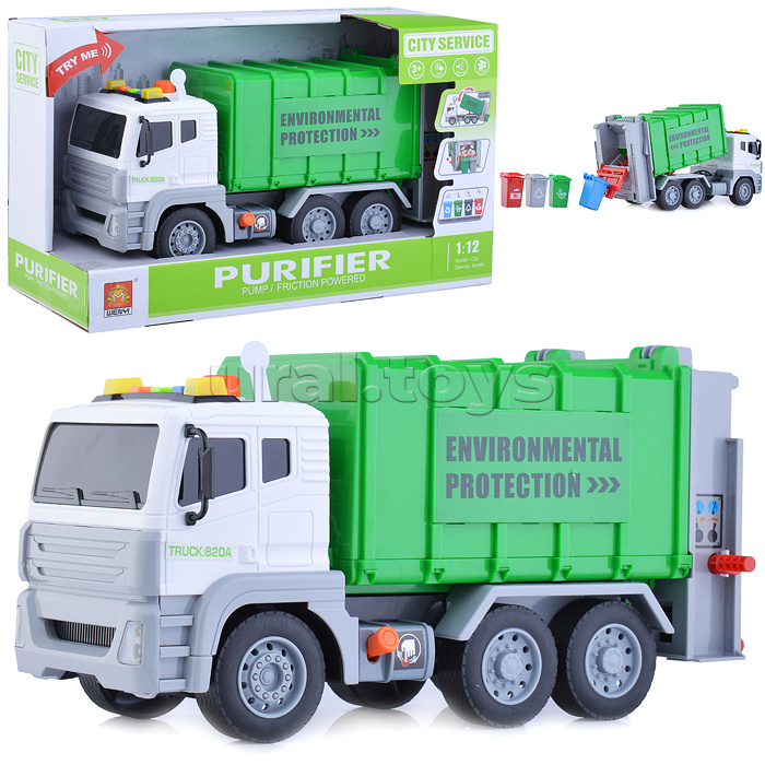 Код: 283744 Страна производитель: Китай Размеры упаковки: 35.5 x 13.5 x 20.5 см Количество в коробке: 18 • В комплекте: - машина мусоровоз (размер:30,5х11 х15,5 см.; масштаб: 1:12). - 4 мусорных бака (3х4х5см) разного цвета с открывающимися крышками. - картонные фишки с изображением отходов. • Машина с инерционным механизмом. • 6 колёс с резиновыми покрышками. • Функции: - кнопка подъёма кузова; - кнопка опускания кузова; - задние ворота кузова подвижные, на газлифтах; - на крыше кабины 2 мигающие лампочки; - 3 кнопки со звуками двигателя, сигнализации и клаксона. - мусорные баки крепят к задней панели, опрокидывают и "мусор" попадает в контейнер с помощью 2-х вращающихся шнеков. • Свет и звук машины работают от 3 батареек AG13/LR44 (входят в комплект). • Материал: пластик, элементы из металла. • Соответствует требованиям безопасности продукции. • Для детей от 3-х лет. Комментарии к товару
