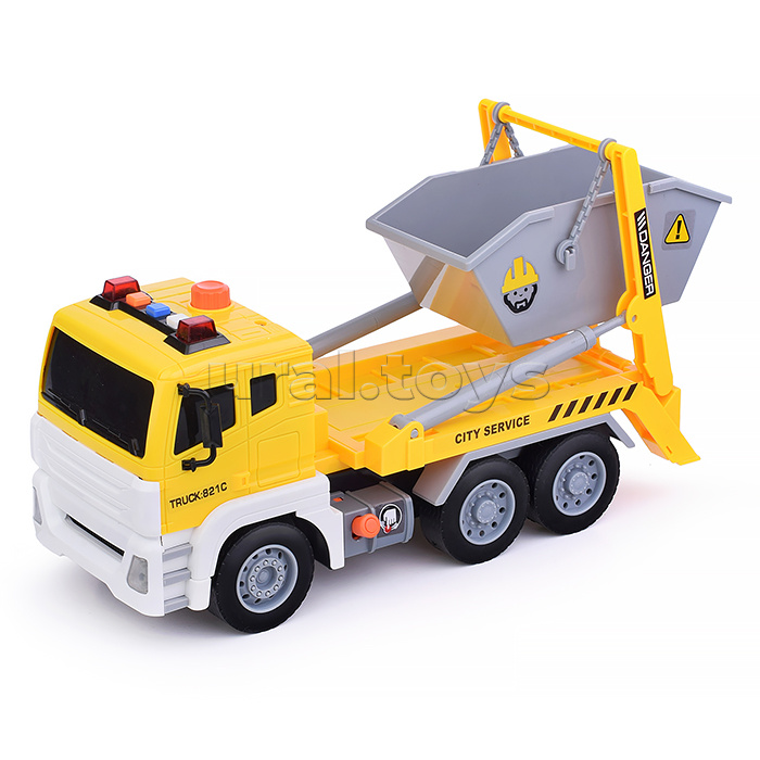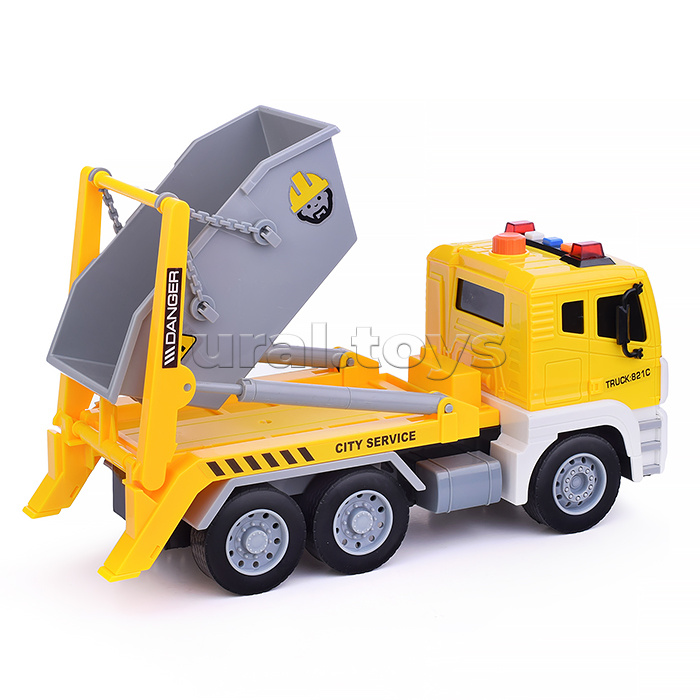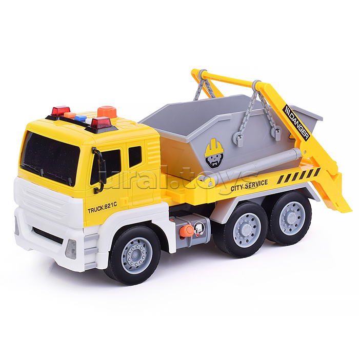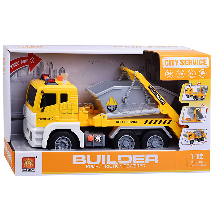Код: 373645 Штрихкод: 6933113292366 Страна производитель: Китай Размеры упаковки: 35 x 14 x 21 см Количество в коробке: 18 Инерционный механизм движения. Кнопки на крыше активируют звуки двигателя, клаксона, заднего хода, сопровождаемые подсветкой проблесковых маячков. Звуки работают от 3-х батареек "AG13" (в комплекте). Контейнер с помповым механизмом поднимается от нажатия оранжевой кнопки на крыше, опускается от нажатия на оранжевый рычажок сбоку. Размер: 29 х 11 х 15 см. Масштаб 1:12. Материал: пластик, пвх. Для детей от 3-х лет. Соответствует требованиям безопасности продукции. Комментарии к товару