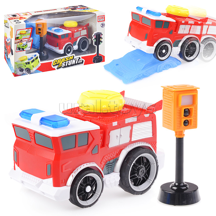 • В комплекте: - пожарная машина, - камера видеофиксации, - дорожная неровность. • Размеры машины (ДхШхВ): 14.5х8.5х9.5 см. • Высота камеры: 12 см. • Размер дорожной неровности: 8.5х12.5х2.5 см. • Особенности и функции: - машина со светом мигалки, сиреной и характерными звуками автомобиля; - поворот жёлтой кнопки переключает режимы работы автомобиля (Краш-тест/Выкл./Вкл.); - при ударе по жёлтой кнопке автомобиль мчится вперёд, он способен преодолевать дорожную неровность, установленную на его пути; - в режиме Краш-тест автомобиль стартует с кнопки, при столкновении останавливается, мигалка отключается; - машина работает от 2-х батареек типа "АА" - входят в комплект для демонстрации; - камера со световым эффектом вспышки и звуками фотофиксации нарушения (работает с кнопки); - камера фиксации работает от 3-х батареек типа "AG3/LR41" (Батарейки входят в комплект для демонстрации); - основание дорожной неровности имеет противоскользящие накладки с клеевой поверхностью. • Материал: пластик, полимерные материалы, элементы из металла. • Соответствует требованиям безопасности продукции. • Для детей старше 3-х лет.