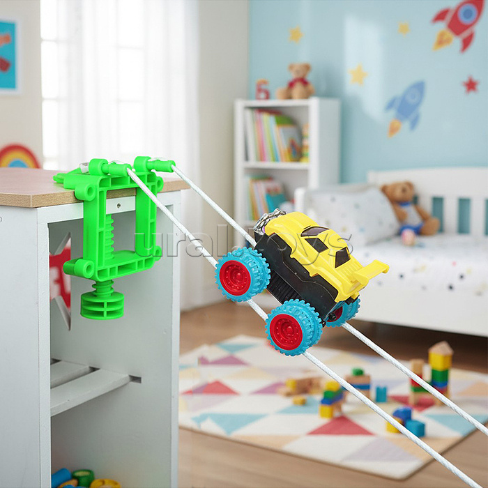 • В наборе: - машинка - работает от 3-х батареек "ААА" (не входят в комплект). - детали для постройки трека. • Размеры машинки: 7х7х6 см. • Машинка может передвигаться по канатам. • Во время движения у машинки мигают огни. • Материал: пластик. • Соответствует требованиям безопасности продукции. • Для детей от 3-х лет.
