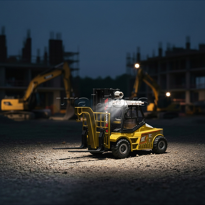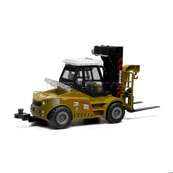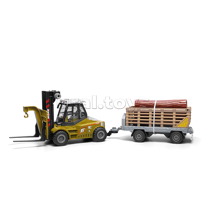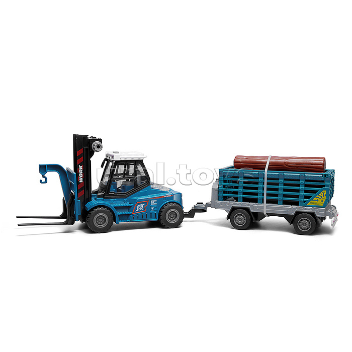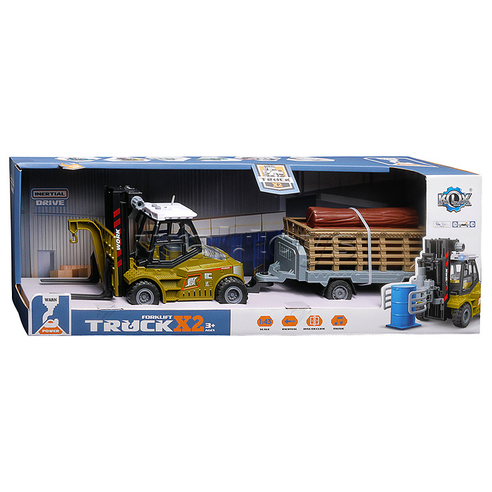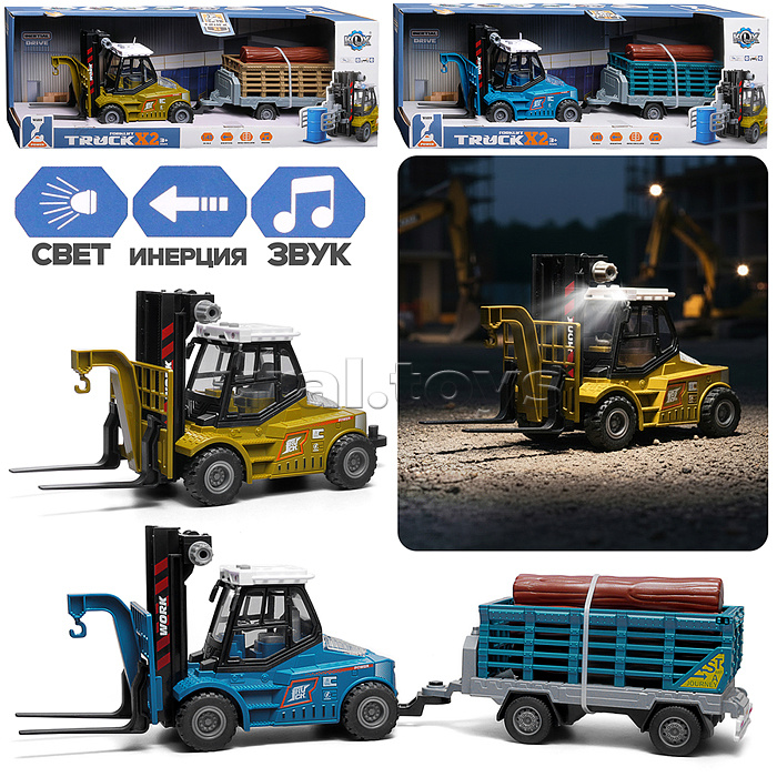 Код: 508364 Штрихкод: 6904111803632 Страна производитель: Китай Размеры упаковки: 12 x 53 x 15 см Количество в коробке: 24 • Размеры погрузчика: 23×8.5×12 см. • Размеры прицепа: 16×7×8 см. • Инерционный механизм движения. • Звук мотора и свет фар. • Свет и звук работают от 3-х батареек «LR44» (входят в комплект для демонстрации) • Металлическая кабина. • Материал: пластик. • Соответствует требованиям безопасности продукции. • Для детей от 3-х лет. Комментарии к товару