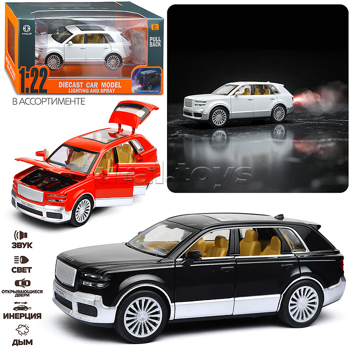 • Размеры игрушки: 22х8х7 см. • Инерционный механизм движения. • Открывающиеся двери, капот и багажник • Пар из сопла (при наличии воды в резервуаре) • Свет фар и звук мотора. • Свет, звук и пар работают от 3-х батареек "ААА" (входят в комплект). • Металлический кузов. • Колёса с резиновыми шинами. • Соответствует требованиям безопасности и стандартам качества продукции. • Для детей от 3-х лет.