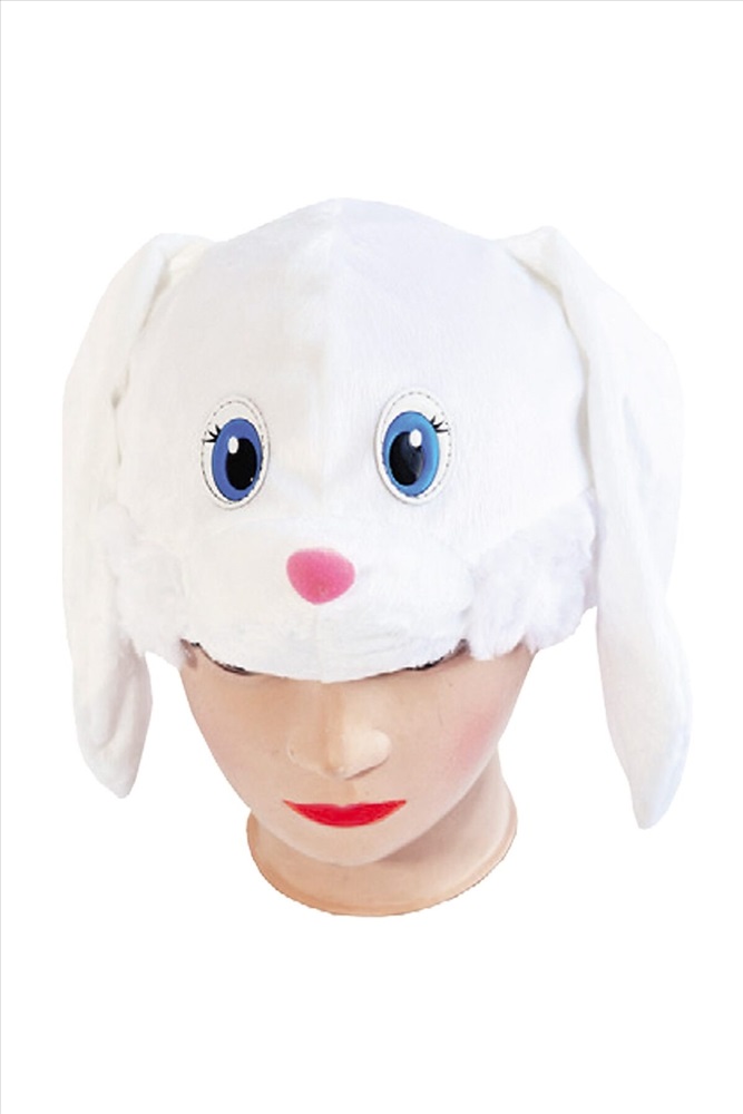 Шапка из белого плюша в виде мордочки Зайца. Длинные висячие ушки по бокам, большие голубые глазки и розовый набивной носик. Шапка удобно сидит на голове и идеально подходит для активного времяпрепровождения во время детских праздников.