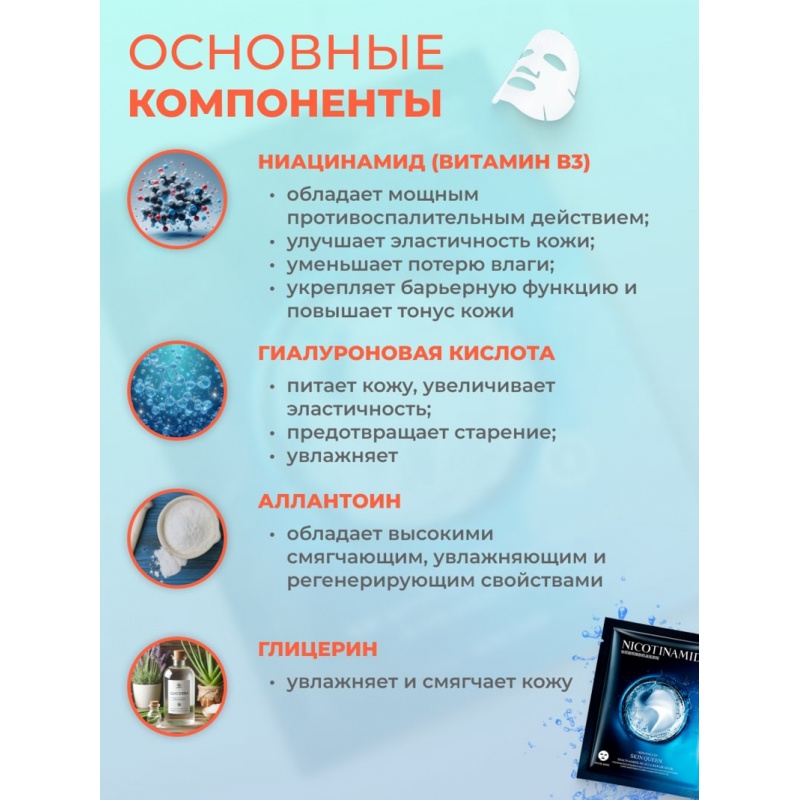 Тканевая маска для лица с гиалуроновой кислотой и витамином B3 (ниацинамид)Эффективная тканевая маска, обогащённая витамином B3 (ниацинамидом), гиалуроновой кислотой, аллантоином и глицерином. Эта комбинация активных ингредиентов обеспечивает комплексный уход за кожей, возвращая ей свежесть, сияние и упругость. Преимущества: - Витамин B3 (ниацинамид): Осветляет и выравнивает тон кожи, уменьшает пигментацию и улучшает текстуру. - Гиалуроновая кислота: Интенсивно увлажняет, предотвращая сухость и шелушение. - Аллантоин: Успокаивает кожу, снимает раздражения и способствует регенерации. - Глицерин: Глубоко питает и помогает сохранить влагу в клетках кожи. Эффект от применения: - Возвращение упругости и эластичности кожи. - Осветление и выравнивание тона. - Разглаживание мелких морщин и уменьшение признаков старения. - Интенсивное увлажнение и питание кожи Как использовать: 1. Очистите кожу лица и аккуратно наложите маску. 2. Оставьте её на 15–20 минут для полного впитывания активных компонентов. 3. Снимите маску, смойте остатки водой или мягко вмассируйте в кожу. Количество: 10 шт. Подарите коже заботу и комфорт с маской, которая делает её увлажнённой, сияющей и молодой! Комментарии к товару