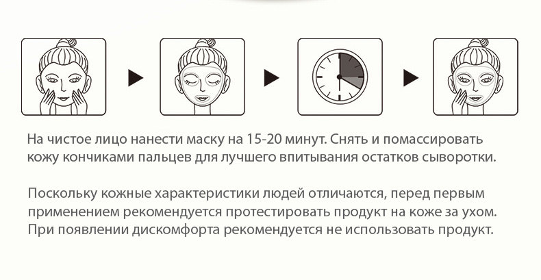 Предварительно очистите кожу средством для умывания. Вскройте упаковку, извлеките ткань и аккуратно нанесите ее на лицо. Время процедуры – 15-20 минут, после этого маску можно снять, а остатки косметики – втереть в кожу массажными движениями. Лучше всего наносить маску вечером, перед сном.