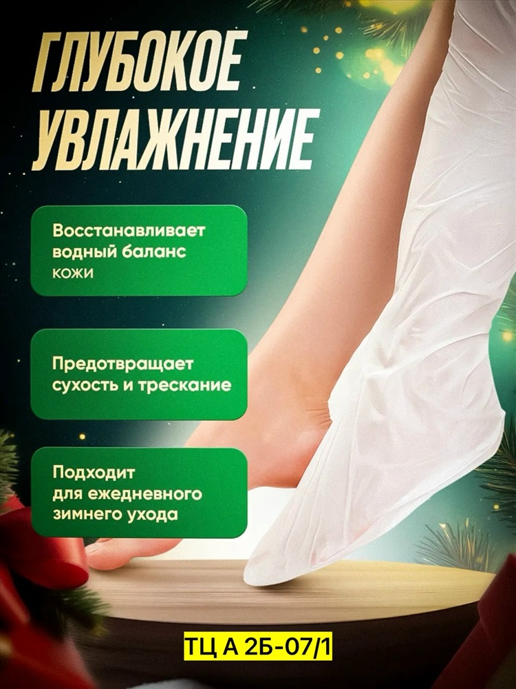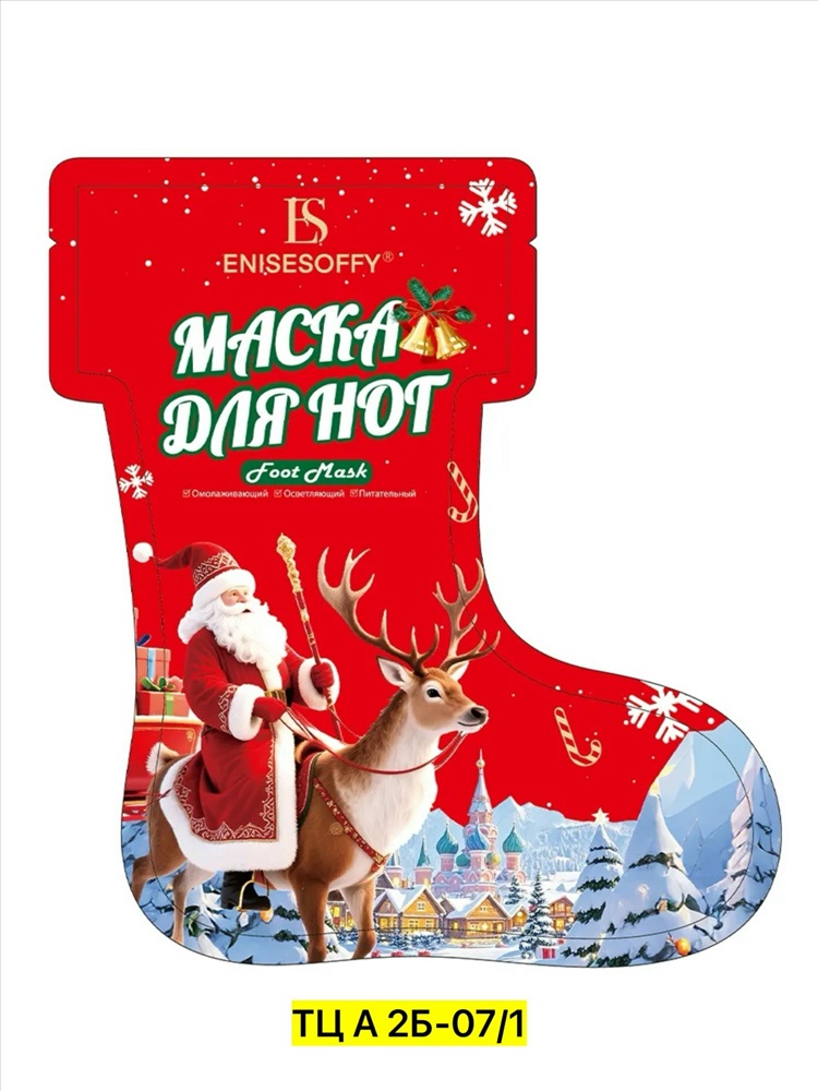 Благодаря своим увлажняющим и питательным свойствам, такая маска помогает сохранить кожу ног мягкой и гладкой, что особенно актуально в холодное время года. Маска интенсивно увлажняет кожу ног, предотвращая сухость и трещины. Натуральные экстракты и масла в составе маски питают кожу, насыщая еe полезными веществами. Маска способствует регенерации кожи, улучшая еe текстуру и внешний вид. Применение маски способствует расслаблению ног, снимая усталость и напряжение после длительного дня. Аромат и оформление маски создают новогоднюю атмосферу, делая уход за собой еще более приятным. Способ применения: очистите и высушите ноги перед применением маски. Затем наденьте маску, слегка надавите на наружный слой пленки, чтобы ноги плотно соприкасались с пленкой. Примерно через 20-40 минут вы можете снять маску, промыть ноги водой, а затем нанести крем.