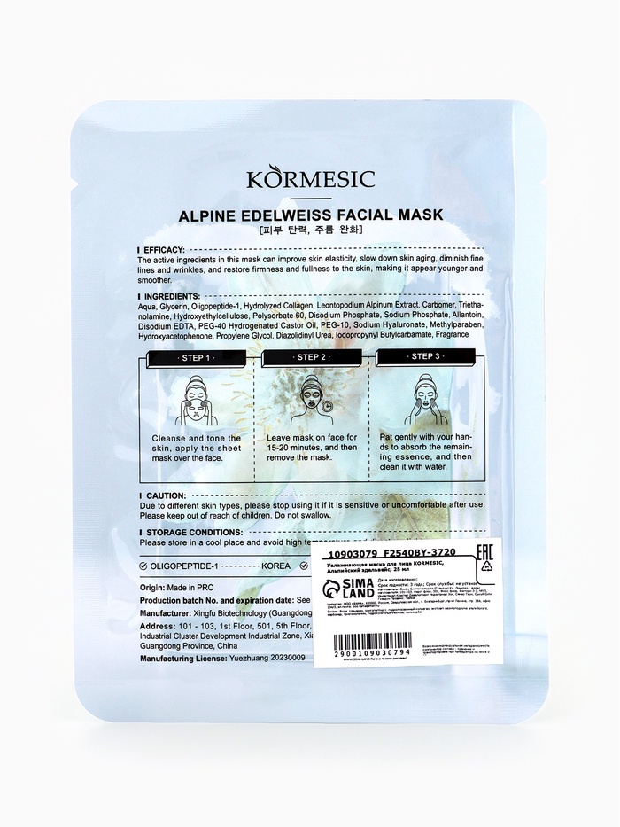 Страна: Китай В боксе: 720 шт Состав: См. на упаковке Материалы: см. на упаковке Фасовка: по 1 шт Сертификат: ЕАС Набор: Нет Вес, г/Объём, мл: 25 Тематика праздника: Универсальная тематика Тип маски: Тканевая Тип кожи: Сухая, Для всех типов Назначение: Увлажнение Погрузитесь в атмосферу нежного ухода и защиты с тканевой маской KORMESIC «Альпийский эдельвейс», созданной для интенсивного увлажнения и восстановления чувствительной кожи. Экстракт альпийского эдельвейса насыщает кожу влагой, укрепляет её природный барьер и придаёт ощущение комфорта и свежести. Мягкая тканевая основа плотно прилегает к лицу, равномерно распределяя эссенцию и создавая охлаждающий и успокаивающий эффект. Уже после первого применения кожа становится более мягкой, увлажнённой и ухоженной. Эффект от применения:
