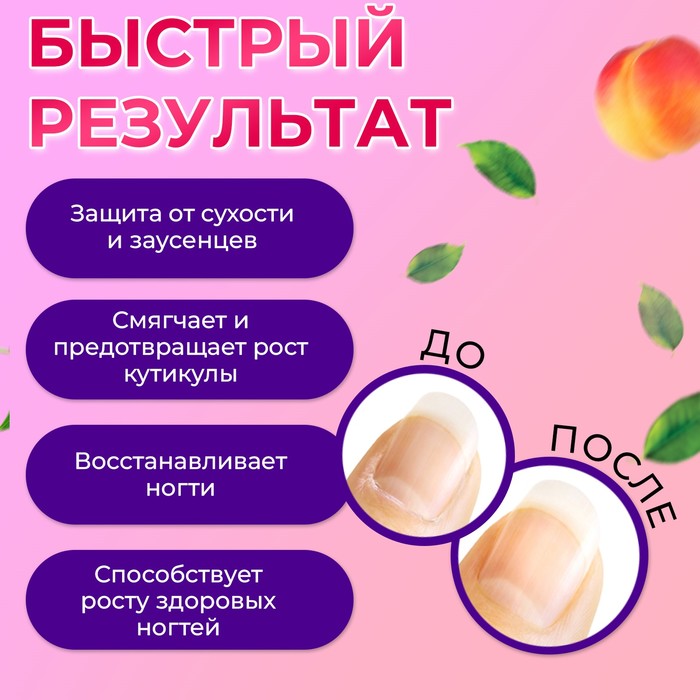 - Содержащиеся в составе натуральные фруктовые масла, кальций, витамины и кератин защищают и увлажняют кутикулу.