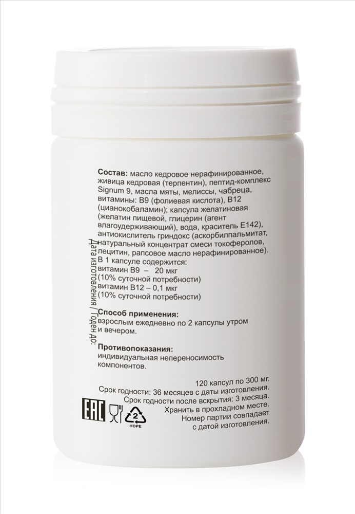 Срок годности: 3 года с даты изготовления, указанной на упаковке СоставМасло кедровое нерафинированное, живица кедровая (терпентин), пептид-комплекс Signum 9, масла мяты, мелиссы, чабреца, витамины: B9 (фолиевая кислота), B12 (цианокобаламин). Вспомогательные вещества: капсула желатиновая (желатин пищевой, глицерин (агент влагоудерживающий), вода, краситель E142), антиокислитель гриндокс (аскорбилпальмитат, натуральный концентрат смеси токоферолов, лецитин, рапсовое масло нерафинированное).