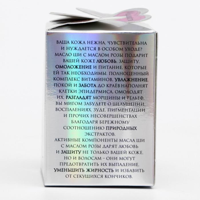Габариты: 6 x 5,5 x 8,5 Страна: Россия В боксе: 30 шт Состав: См. на упаковке Материалы: см. на упаковке Фасовка: по 1 шт Индивидуальная упаковка: Картонная коробка / упаковка Сертификат: ЕАС Объём, мл: 100 Темпер. ограничение НЕ НИЖЕ ℃: 0 Фиксированная цена: Да Ваша кожа нежна, чувствительна и нуждается в особом уходе? Масло ши c маслом розы подарит вашей коже любовь, защиту, омоложение и питание, которые ей так необходимы. Полноценный комплекс витаминов, увлажнение, покой и забота до краёв наполнят клетки эпидермиса, омолодят их, разгладят морщины и рельеф. Вы мигом забудете о шелушении, воспалениях, зуде, пигментации и прочих несовершенствах благодаря бережному соотношению природных экстрактов. Активные компоненты масла ши с маслом розы дарят любовь и защиту не только вашей коже, но и волосам – они могут предотвратить их выпадение, уменьшить жирность и избавить от секущихся кончиков. Состав: масло дерева ши, масло чайной розы, вытяжка целебной грязи озера Тамбукан, яркие эмоции.