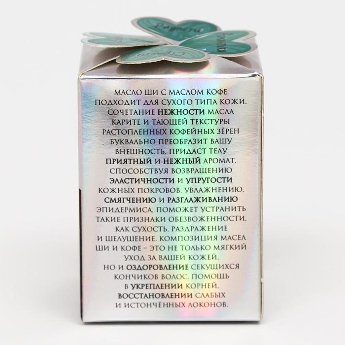 Габариты: 5 x 5 x 8 Страна: Россия В боксе: 30 шт Состав: См. на упаковке Материалы: см. на упаковке Фасовка: по 1 шт Индивидуальная упаковка: Картонная коробка / упаковка Сертификат: ЕАС Вес, г/Объём, мл: 100 Объём, мл: 100 Аромат: Кофе Назначение: Универсальные Темпер. ограничение НЕ НИЖЕ ℃: 0 Фиксированная цена: Да Масло ши с маслом кофе возвращает коже эластичность и повышает упругость. Способствует обновлению и омоложению, глубоко увлажняет. Экстракт кофе оказывает тонизирующее действие, смягчает, подтягивает и разглаживает кожу, предотвращает её преждевременное старение. Восстанавливает волосы, защищает их от неблагоприятного воздействия окружающей среды. Состав: масло дерева ши (карите), масло жареного кофе, вытяжка целебной грязи озера Тамбукан. Комментарии к товару