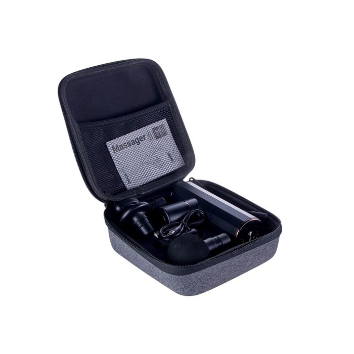 Габариты: 19,5 x 19 x 7,2 Страна: Китай В боксе: 20 шт Состав: Металл, пластик Материалы: металл, пластик Фасовка: по 1 шт Индивидуальная упаковка: Цветная картонная коробка Габариты товара: 5 см × 17 см × 20 см Сертификат: ЕАС Тип питания: От USB Цвет: Чёрный Количество режимов: 4 Количество насадок: 4 Гарантийный срок, мес.: 6 Вид массажа: Перкуссионный Тип массажёра: Перкуссионный Автоматическое отключение: Нет Фиксированная цена: Да Идеальный помощник для расслабления после напряженного дня — перкуссионный массажер с 4 режимами и 4 сменными насадками. Этот компактный и мощный прибор станет незаменимым в вашем арсенале для восстановления мышц и улучшения самочувствия. С легкостью снимайте усталость и напряжение благодаря различным режимам работы, которые позволяют настроить интенсивность массажа под ваши нужды. Встроенный аккумулятор обеспечивает длительное время работы, а современный дизайн делает устройство удобным в использовании. Возьмите его с собой в поездки или используйте дома — он всегда будет под рукой.