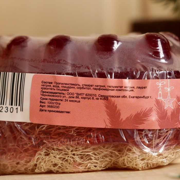 Габариты: 8,5 x 6 x 4,5 Страна: Россия В боксе: 50 шт Состав: См. на упаковке Материалы: см. на упаковке Фасовка: по 1 шт Индивидуальная упаковка: Без упаковки Сертификат: ЕАС Цвет: Фиолетовый Вес, г/Объём, мл: 100 Вид упаковки: Термоусадочная плёнка Тематика праздника: Новый год Область применения: Для тела Аромат: Брусника, Корица Тип: Твёрдое Вид мыла: Массажное, Банное, Косметическое, Глицериновое Темпер. ограничение НЕ НИЖЕ ℃: 0 Массажное мыло с люффой — это универсальное средство для ухода за кожей, которое сочетает очищение, мягкий массаж и эффект пилинга. Благодаря встроенной люффе, мыло эффективно удаляет омертвевшие клетки кожи, стимулирует кровообращение и делает кожу гладкой и упругой. Преимущества: