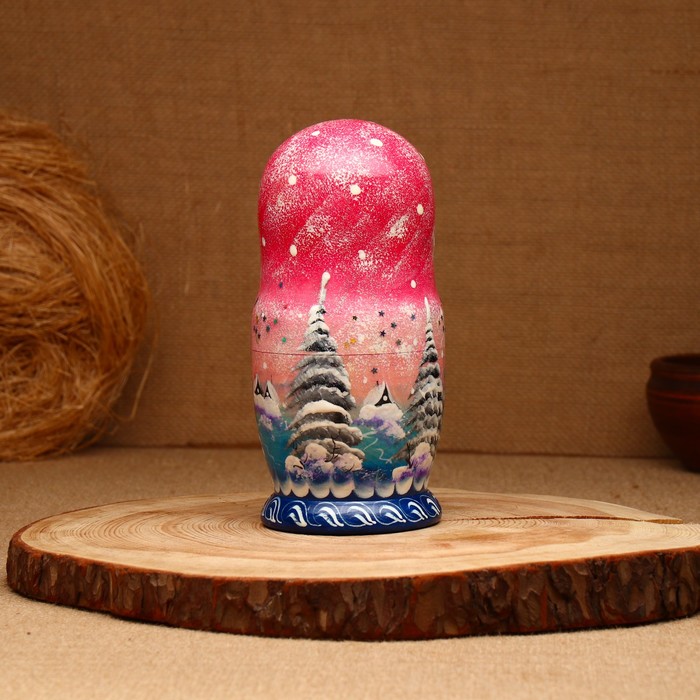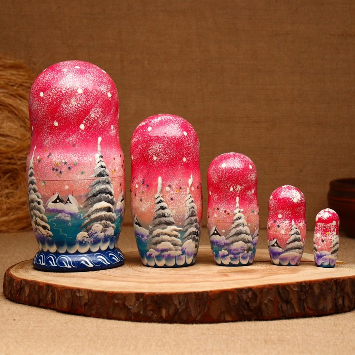 Пять деревянных сестриц в нежном розовом наряде принесут в дом атмосферу старинной сказки и зимнего уюта. Эта матрёшка, расписанная вручную, раскрывается как драгоценный ларец, хранящий внутри целую семью — от статной красавицы до самой маленькой, завершающей композицию.
