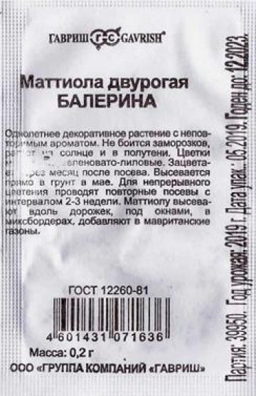 Однолетнее декоративное растение с неповторимым ароматом. Не боится заморозков, растет на солнце и в полутени. Цветки маленькие, зеленовато-лиловые. Зацветает через месяц после посева. Высевается прямо в грунт в мае. Для непрерывного цветения проводят повторные посевы с интервалом 2-3 недели. Маттиолу высевают вдоль дорожек, под окнами, в миксбордерах, добавляют в мавританские газоны. Фасовка 0,2г Комментарии к товару