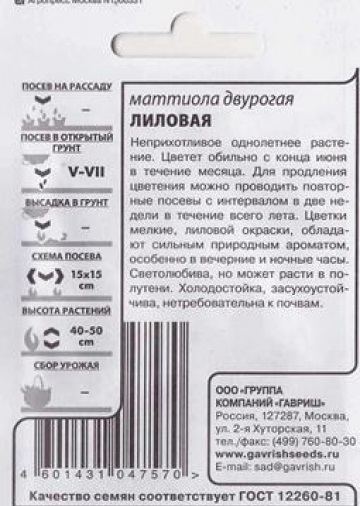 Неприхотливое декоративное однолетнее растение из семейства Крестоцветные высотой до 40-50 см. Цветет обильно с конца июня в течение месяца. Для продления цветения можно проводить повторные посевы с интервалом в две недели в течение всего лета. Цветки мелкие, лиловой окраски, обладают сильным природным ароматом, особенно в вечерние и ночные часы. Светолюбива, но может расти в полутени. Холодостойка, засухоустойчива, нетребовательна к почвам. Выращивают прямым посевом в грунт в начале мая. Всходы появляются через 10-12 дней, их прореживают, оставляя между растениями 15 см. Используется для посадки вдоль дорожек, возле террас, беседок, а также в миксбордерах и мавританских газонах.