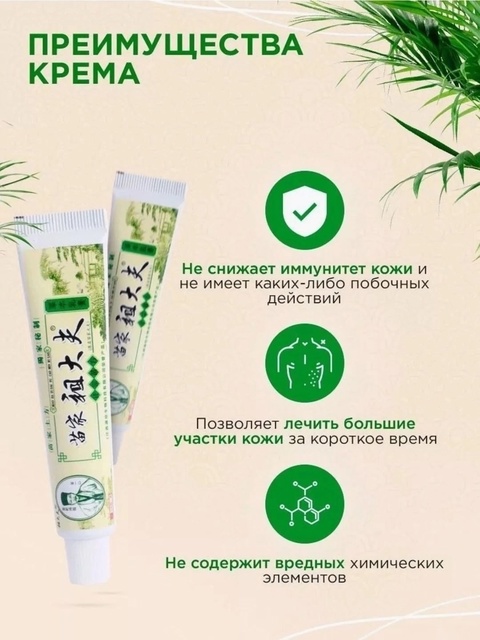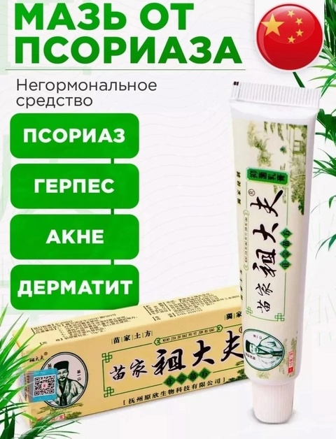 Крем мазь для лица и тела Zudaifu Зудайфу имеет оригинальную рецептуру - средство номер один в Китае от псориаза, дерматита, витилиго, грибковых поражений и прочих болезней кожи. Крем-мазь нежно проникает в глубокие слои кожи, увлажняет и питает ее, способствуя заживлению и регенерации тканей. Наша формула также содержит растительные экстракты, которые помогают успокоить кожу и уменьшить зуд. Показания к применению: псориаз, витилиго, грибковые инфекции, поражение кожи стафилококком и бактериями кандида, лишай, ихтиоз, раздражения и покраснения кожи, кожный зуд, зуд наружных половых органов, акне, укусы комаров и насекомых, потница, экзема, дерматит, атопический дерматит, нейродермит, герпес. Крем создан с учетом всех типов кожи, даже самой чувствительной. - Эффективно справляется с зудом, воспалениями и другими кожными проблемами. - Увлажняет и питает кожу. - Способствует быстрому заживлению ран и ранок. - Имеет натуральный состав без вредных химических добавок. Способ применения: наносится в небольшом количестве на чистый и сухой участок тела и аккуратно втирается до полного впитывания. Использовать ежедневно, не реже двух раз. При этом возникает ощущение легкой свежести, редко - небольшого жжения. Только для наружного применения! Применяется до полного исчезновения неприятных симптомов и еще дополнительно 2 - 3 недели для достижения устойчивой ремиссии. Курс лечения может варьироваться в зависимости от тяжести проблемы. Внимание! Не является лекарственным средством. Противопоказания: Беременность, период лактации, не использовать детям младше 3 лет. Может быть индивидуальная непереносимость компонентов!