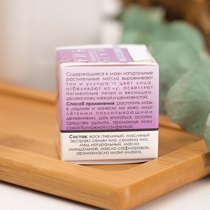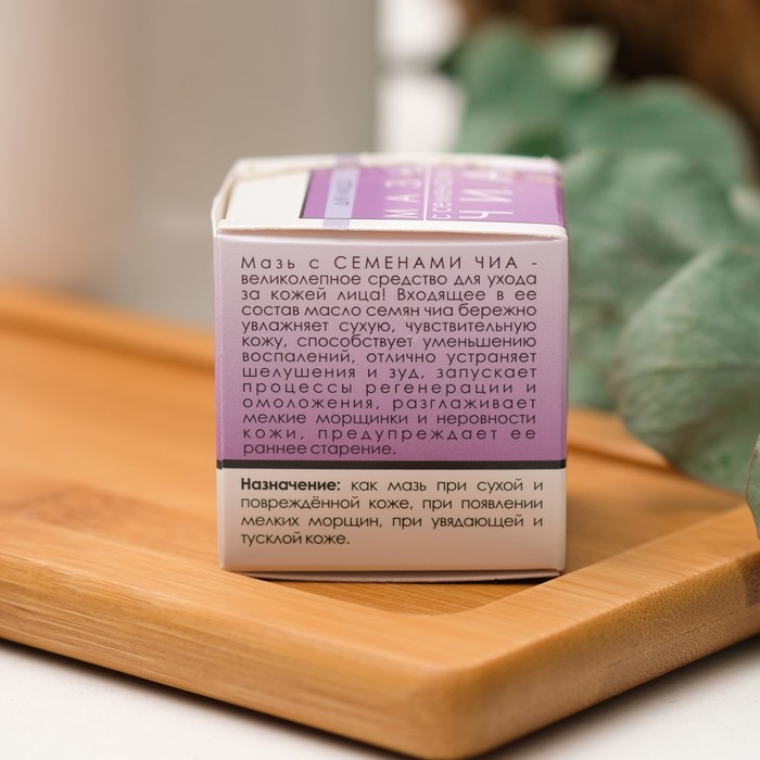 Габариты: 4,6 x 4,6 x 4,6 Страна: Россия В боксе: 80 шт Состав: См. на упаковке Материалы: см. на упаковке Фасовка: по 1 шт Индивидуальная упаковка: Картонная коробка / упаковка Сертификат: ЕАС Вес, г/Объём, мл: 28 Темпер. ограничение НЕ НИЖЕ ℃: 0 Тип кожи: Сухая Возраст: Для всех возрастов Применение: Универсальный Мазь с семенами чиа - великолепное средство для ухода за кожей лица! Входящее в ее состав масло семян чиа бережно увлажняет сухую, чувствительную кожу, способствует уменьшению воспалений, отлично устраняет шелушения и зуд, запускает процессы регенерации и омоложения, разглаживает мелкие морщинки и неровности кожи, предупреждает ее раннее старение. Назначение: как мазь при сухой и повреждённой коже, при появлении мелких морщин, при увядающей и тусклой коже. Содержащиеся в мази натуральные растительные масла выравнивают тон и улучшают цвет лица, отбеливают кожу, осветляют пигментные пятна и веснушки, делают кожу мягкой и шелковистой. Способ применения: растопить мазь в ладонях и нанести на кожу лица лёгкими похлопывающими движениями, дать впитаться, остатки средства удалить, промокнув кожу сухой бумажной салфеткой. Состав: воск пчелиный, масляный экстракт семян чиа, семена чиа, мед натуральный, масло миндальное, масло сафлоровое, аромамасло иланг-иланга. Комментарии к товару