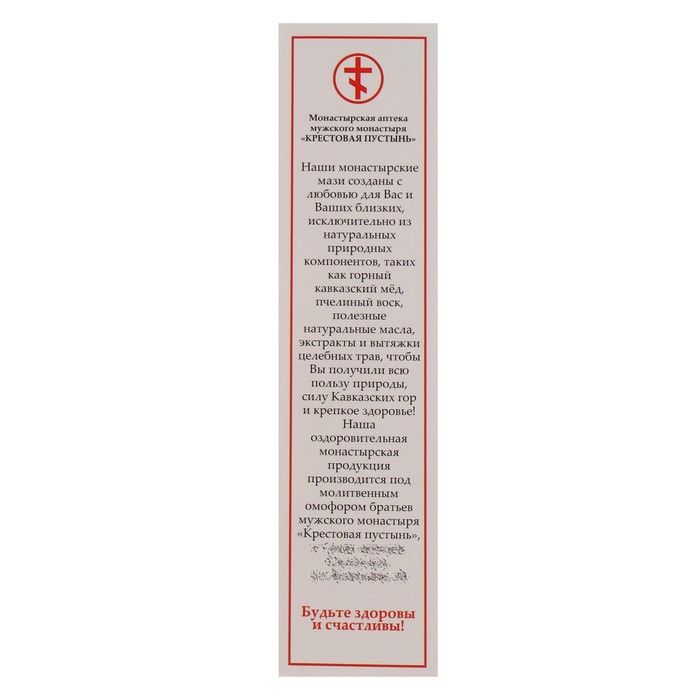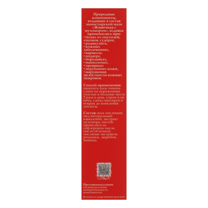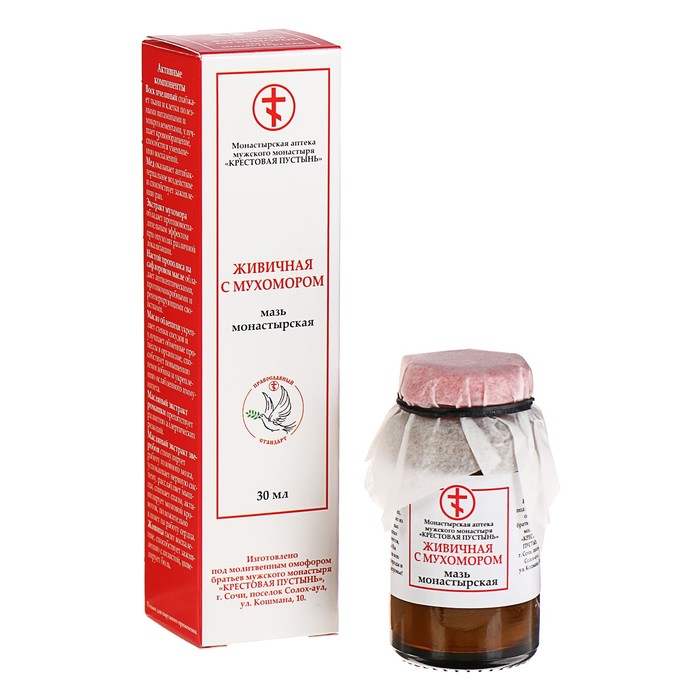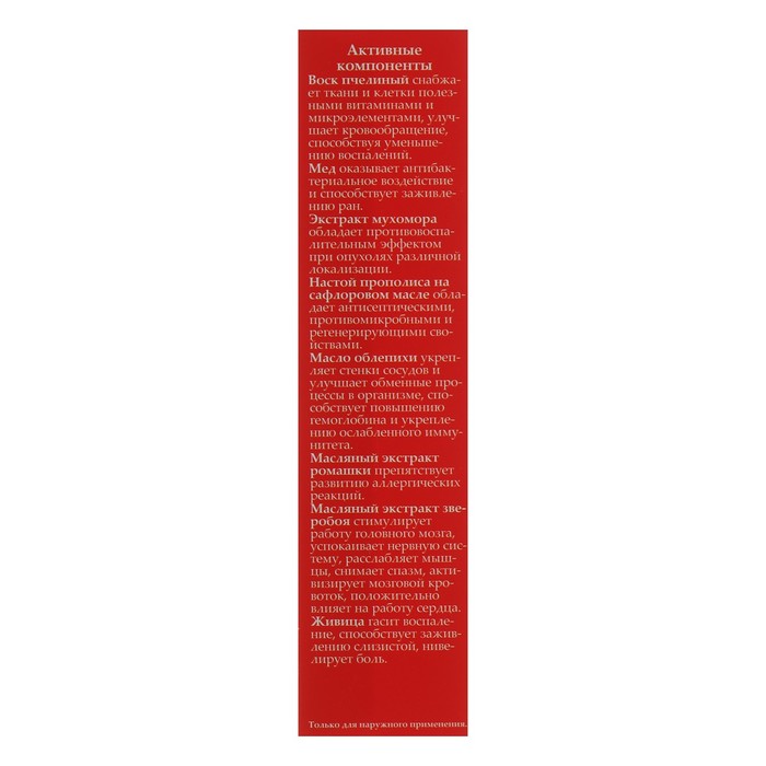 Габариты: 3,5 x 3,5 x 7 Страна: Россия В боксе: 80 шт Состав: См. на упаковке Материалы: см. на упаковке Фасовка: по 1 шт Индивидуальная упаковка: Картонная коробка / упаковка Сертификат: ЕАС Вес, г/Объём, мл: 30 Назначение: От синяков, ушибов и ссадин Темпер. ограничение НЕ НИЖЕ ℃: 0 Показания: Боль Компоненты: Мухомор, Ромашка, Мёд, Пчелиный воск Действие: Общеукрепляющее, Противовоспалительные, Заживляющие Фиксированная цена: Да Мазь «Живичная с мухомором» обладает сильным ранозаживляющим действием, снимает воспаления, оказывает бактерицидный, дезинфицирующий, противоинфекционный эффект. Снимает боли в суставах, боли от опухолей, спазмов, судорог, радикулита. Помогает при кожных заболеваниях, варикозе, подагре, устраняет бородавки, папилломы, трещины и огрубение кожи. Способ применения: наносите мазь тонким слоем на поражённые участки и больные места 2 раза в день, слегка массируя и втирая до появления теплоты. Противопоказания: аллергия на препараты мёда и продукты пчеловодства. Состав: воск пчелиный, мед натуральный кавказский, экстракт мухомора, масляные экстракты ромашки, зверобоя, живица. Комментарии к товару